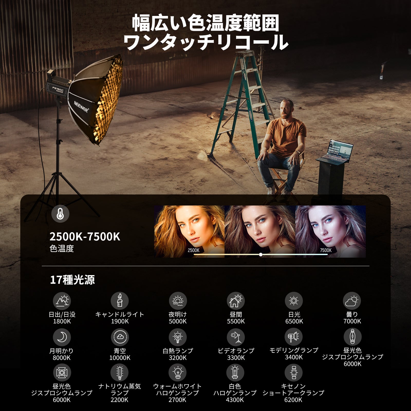 - 【高輝度&高出力&多用途】NEEWER FS150C RGB ビデオライトは、130W出力の高品質COB LEDを搭載。付属のリフレクター使用時に最大19,800lux/1mの高照度を実現できるスタジオライトです。本製品の重量はわずか1.77kg、寸法 (200x120x130mm)で、自由な角度で調整できる180 度傾斜スタンドマウントアダプターが付属しています。ポートレート写真、YouTube/TikTok動画撮影、映画制作、スタジオ撮影、商品撮影、インタビュー収録、ライブ配信など、多様な映像制作環境に対応します。