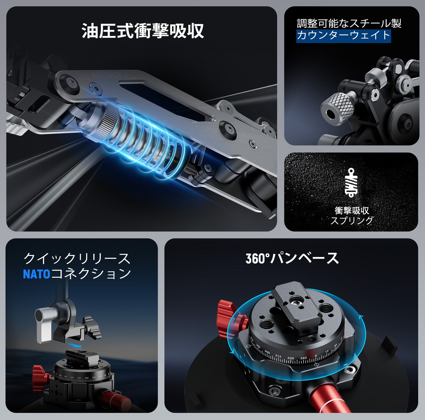 - 【柔軟な油圧ブームアーム】油圧ブームアームは、NATOクランプを介して吸盤に取り付けられています。2つの180°チルトジョイントにより、簡単かつ正確な位置決めが可能です。後部のネジノブは、デバイスをカウンターウェイト、使用中の安定性を向上させます。ブームアームの理想的な荷重は150~500gです。