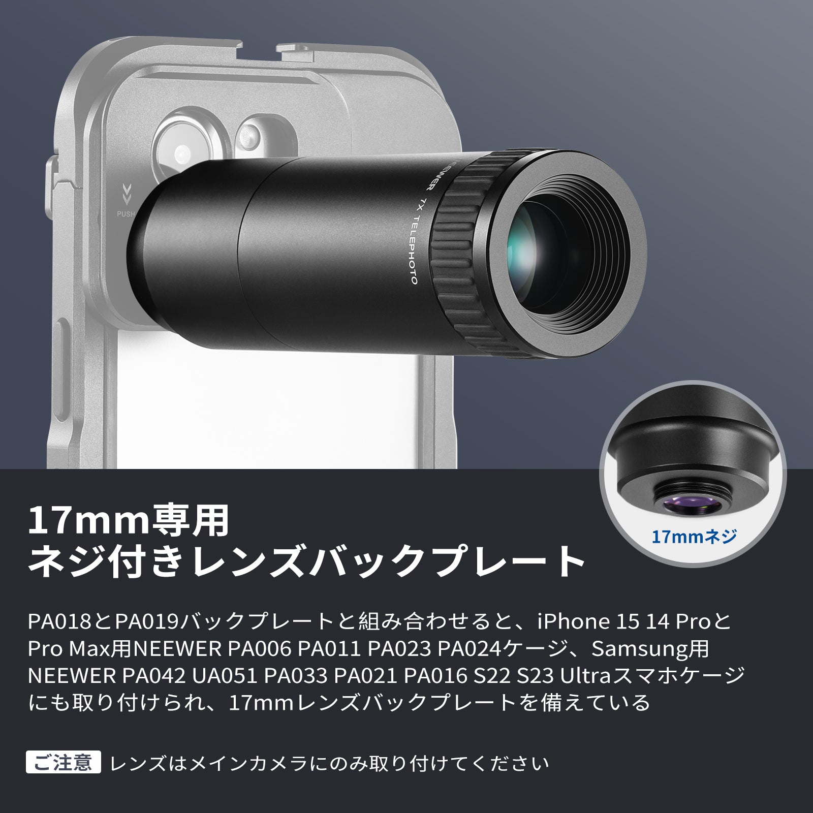 - 【17mmスレッドのスマホケージ/ケース/クランプに適用】レンズは直接使用できず、17mm スレッドのスマホケージ/ケース/クランプ (付属していません) と一緒に使用する必要があります。コンパチブルiPhone 17 16 15 Pro/Pro Max Plus 14 13 12 Mini XR X XS(マクロ機能を無効にしてください)。コンパチブルSamsung Galaxy S24 Ultra S23 S22(マクロ機能を無効にしてください)。ご注意:Mマウント/Tマウントには対応しません。