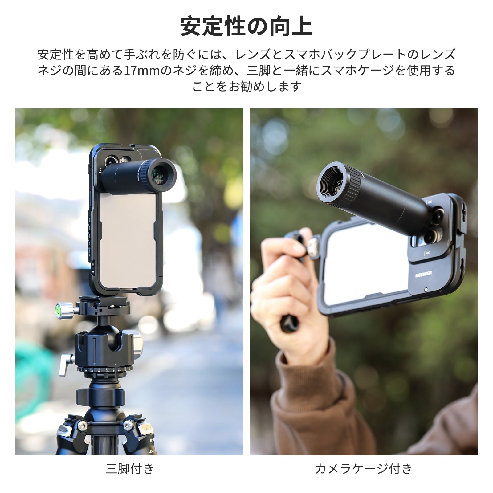 1.より良い安定性を実現し、ブレを避けるために、レンズとスマホのバックプレートのレンズネジの間の17mmのネジを締め、スマホケージと三脚を使用することをお勧めします。
