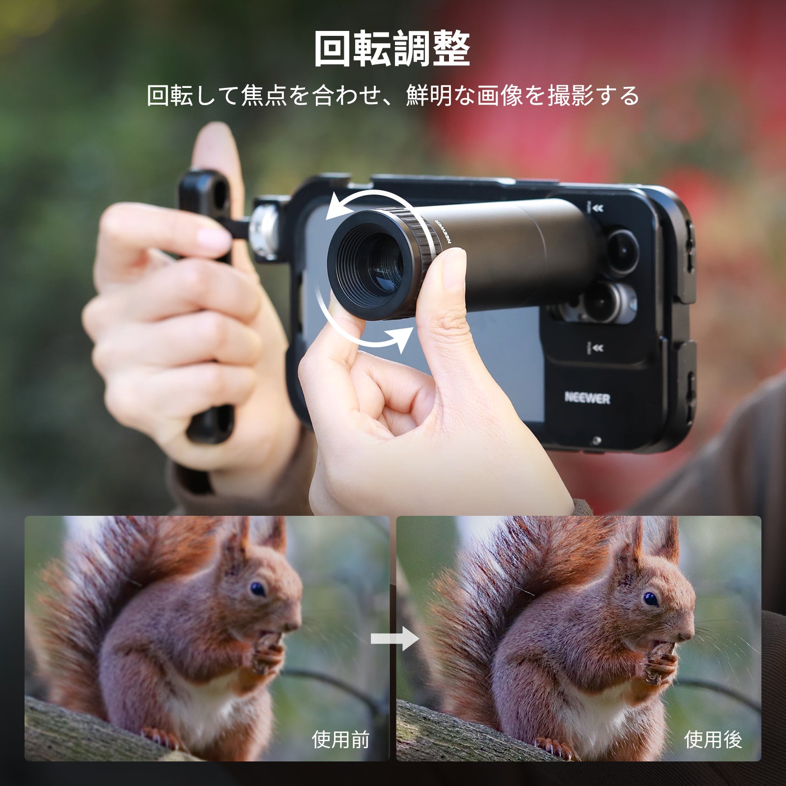 【ご注意】1.使用前に、スマホのメインカメラと追加カメラを掃除してください。スマホモデルによってはケラレが発生する場合があります。その場合は、レンズを締めるか、カメラの倍率を1.1倍以上にズームしてください。2.安定性を高めて揺れを防ぐため、レンズとスマホケージ、スマホケース、またはバックプレートの間に隙間がなくなるまでレンズを締めてください。 鮮明な写真を撮るには三脚の使用をお勧めします