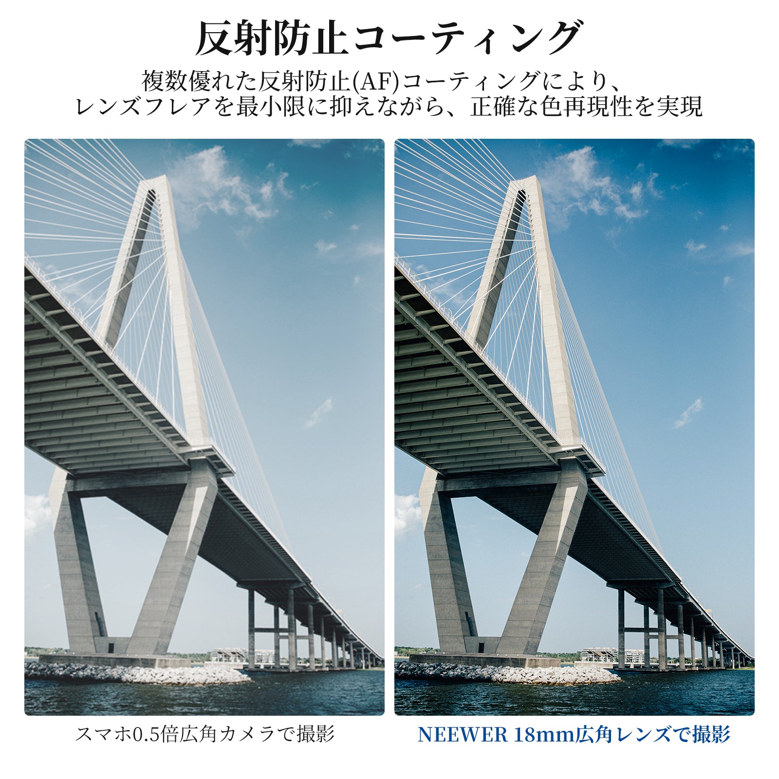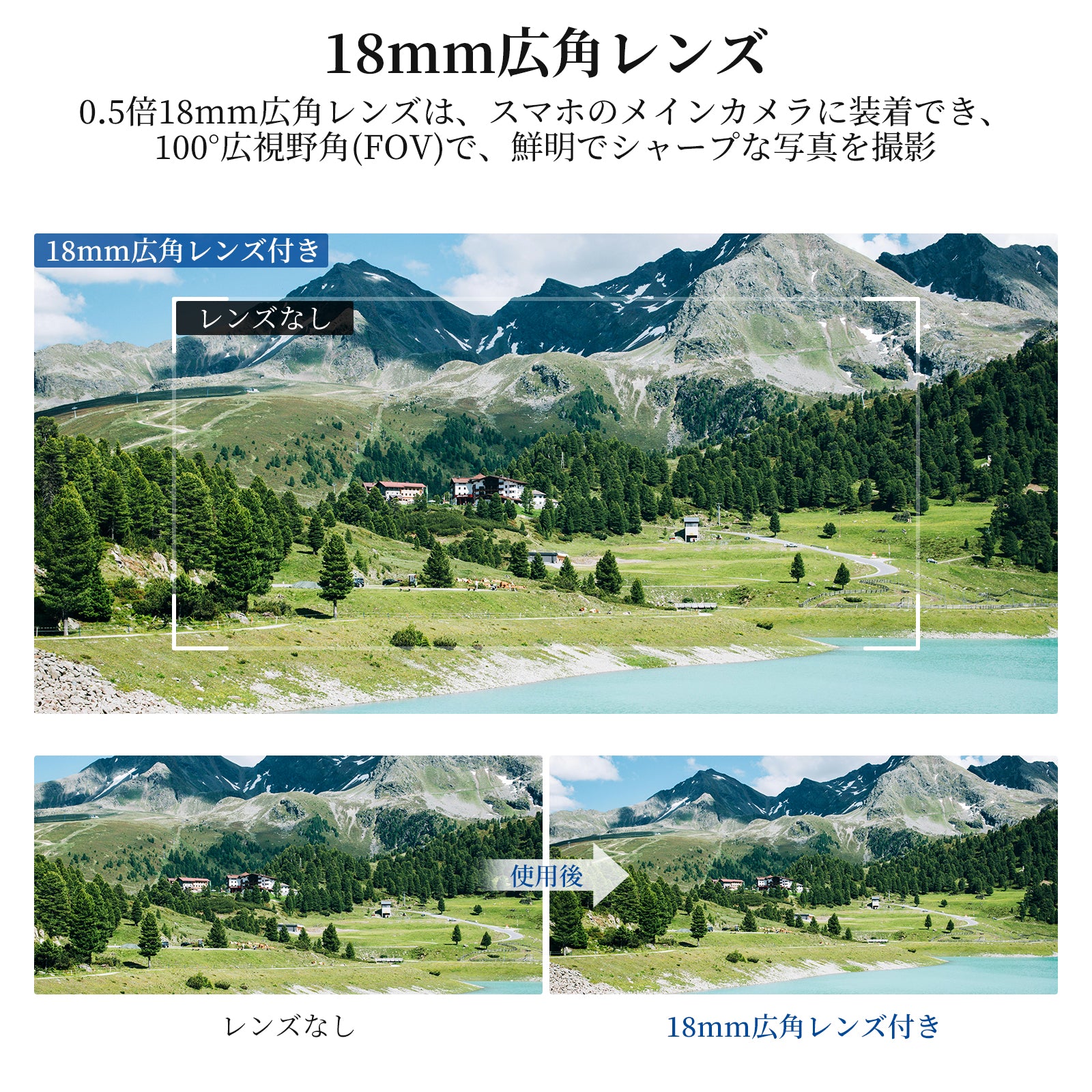 - 【18mm広角レンズ】 18mm広角レンズは0.75倍倍率で、スマホのメインカメラに取り付け、100°広い視野角(FOV)と創造なエッジディストーションにより、鮮明でシャープな写真を撮影できます。野生動物、自然風景、街並み、コンサート、集合写真など、様々なシーンに最適です。