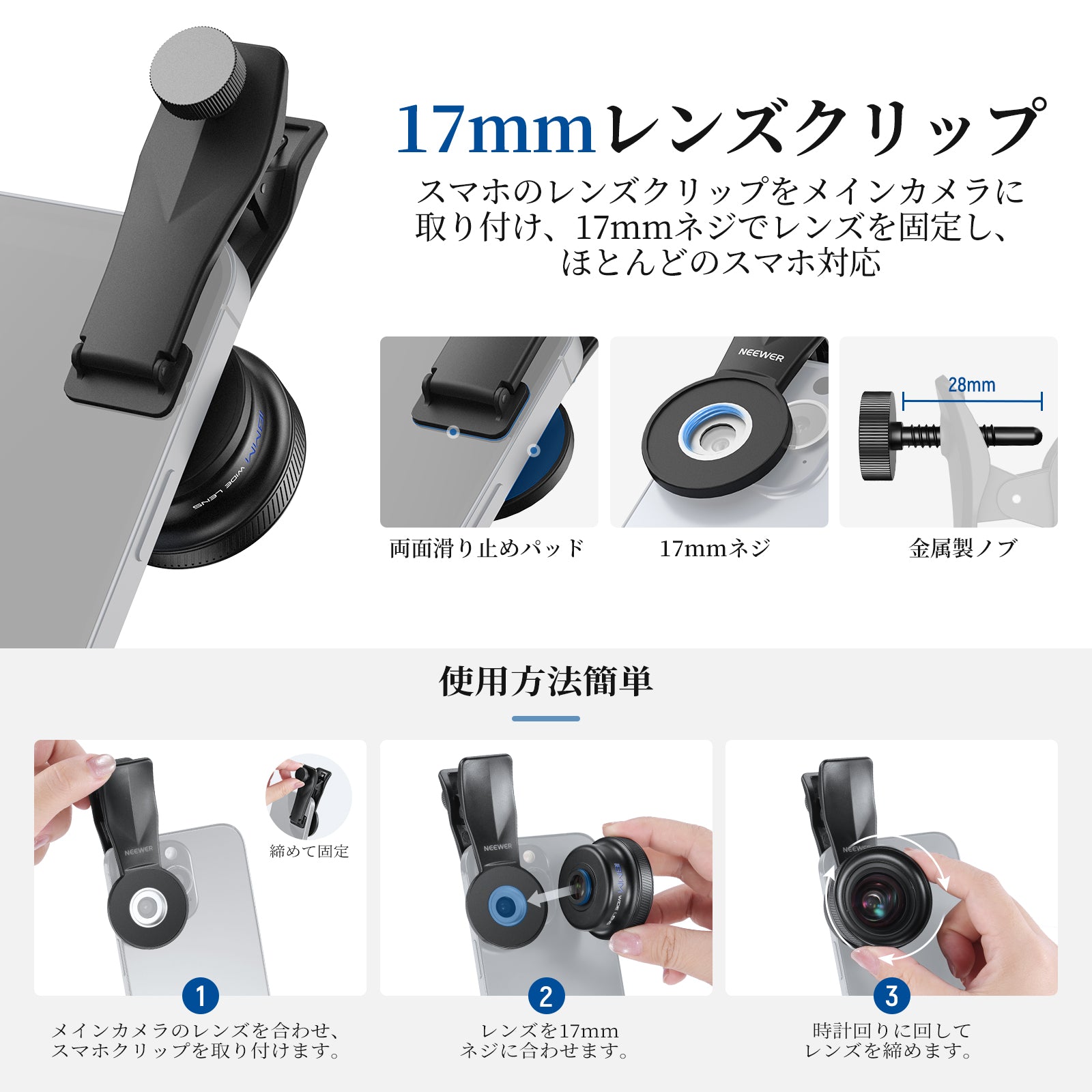 - 【17mmネジ付きレンズクリップ】 広角レンズはスマホレンズクリップをメインカメラに取り付けられ、17mmネジで固定します。 28mm調整可能な開口部を備え、コンパチブル iPhone 16 Pro Max、15、14、13 Pro Max、Android、Galaxy S25 Ultra。NEEWERスマホケージ/ケース、17mmレンズマウントネジ付きバックプレートも使用できます。