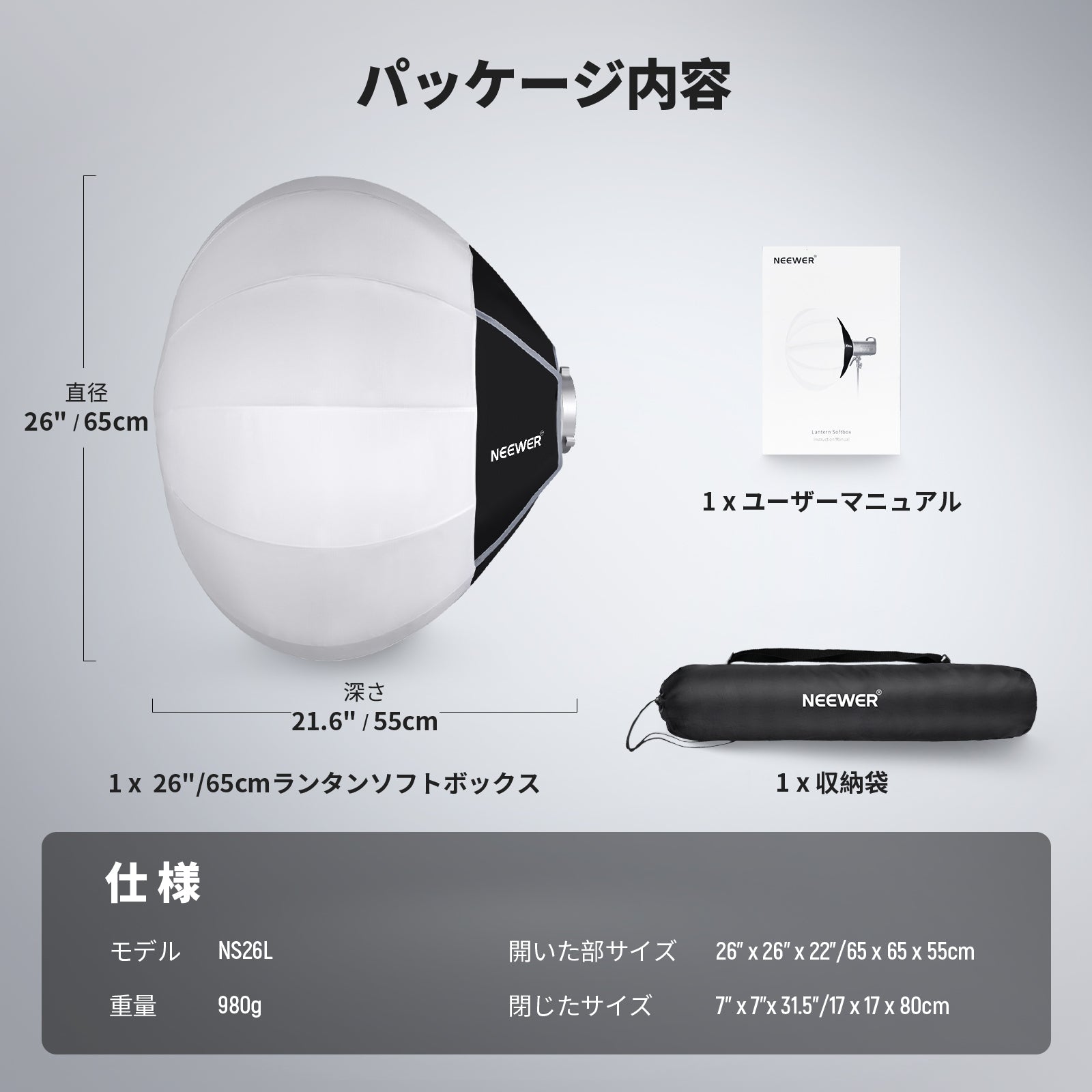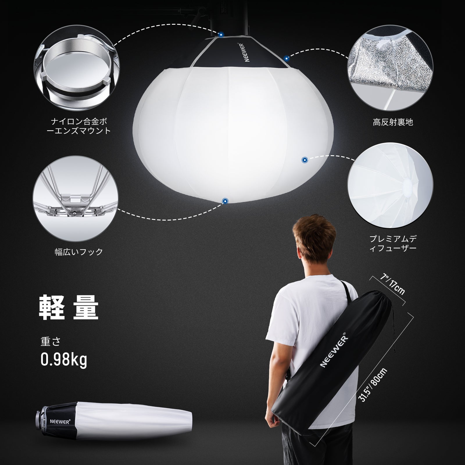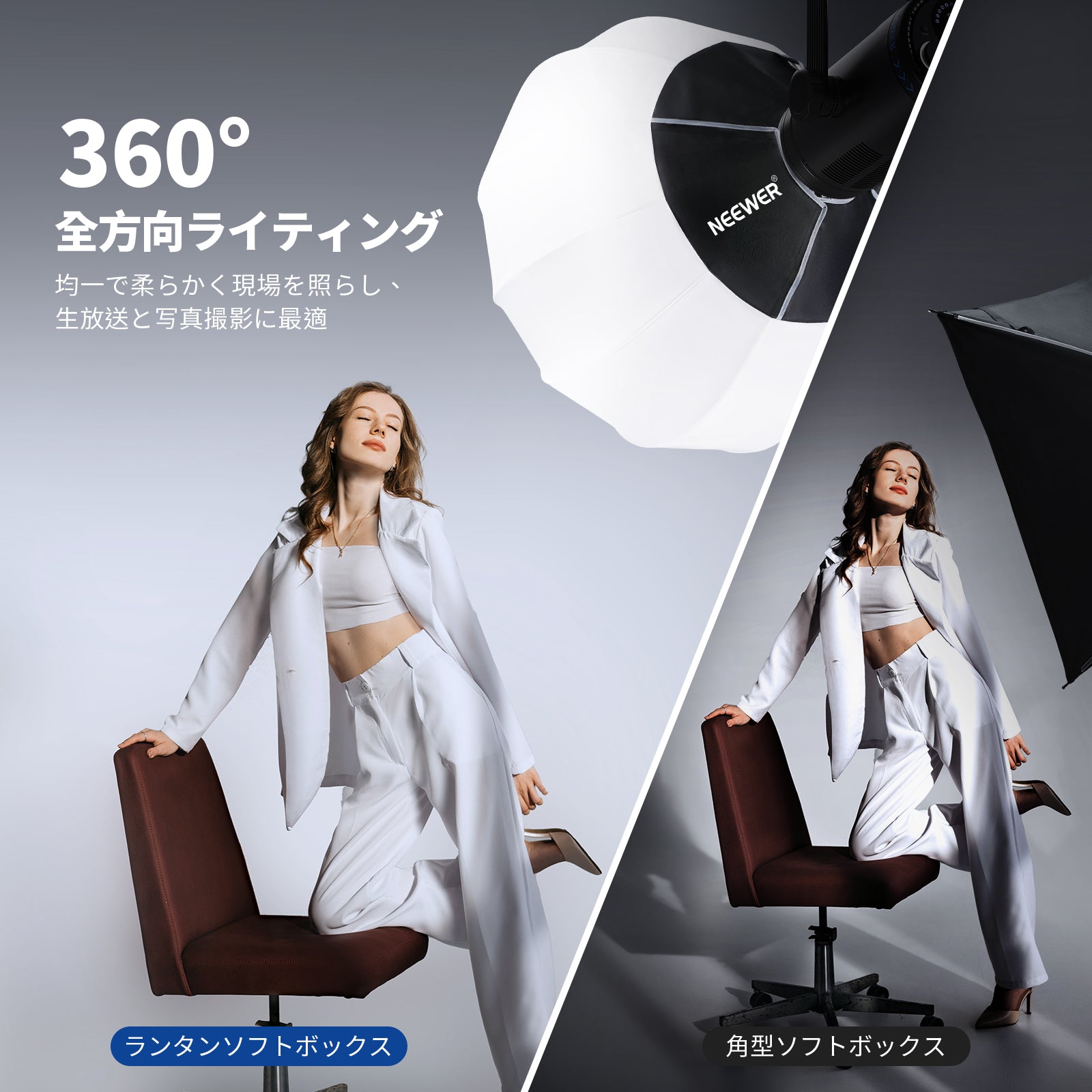 - 【360°全方位ソフト光源】この 26"/65cm NEEWERランタンソフトボックスは、影がなく、バランスのとれた広範囲の360°の光をカバーし、写真、ビデオブログ、生放送、インタビューに最適です。閉じた状態の寸法は7"x7"x31.5" (17x17x80cm)で、収納袋に収まるので持ち運びが簡単です。