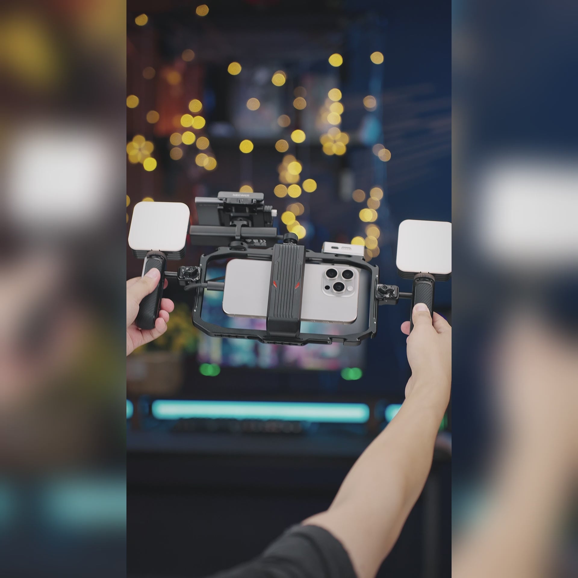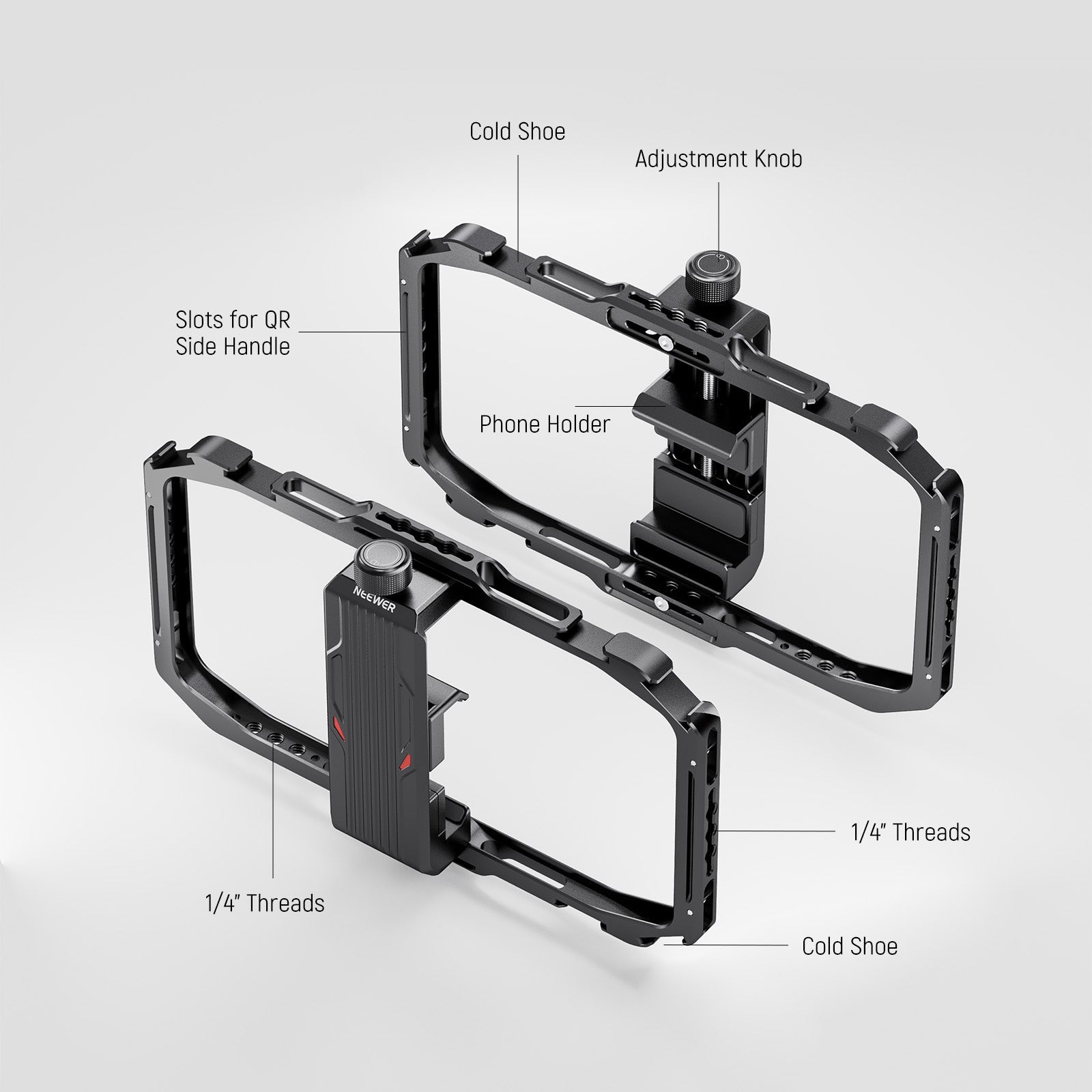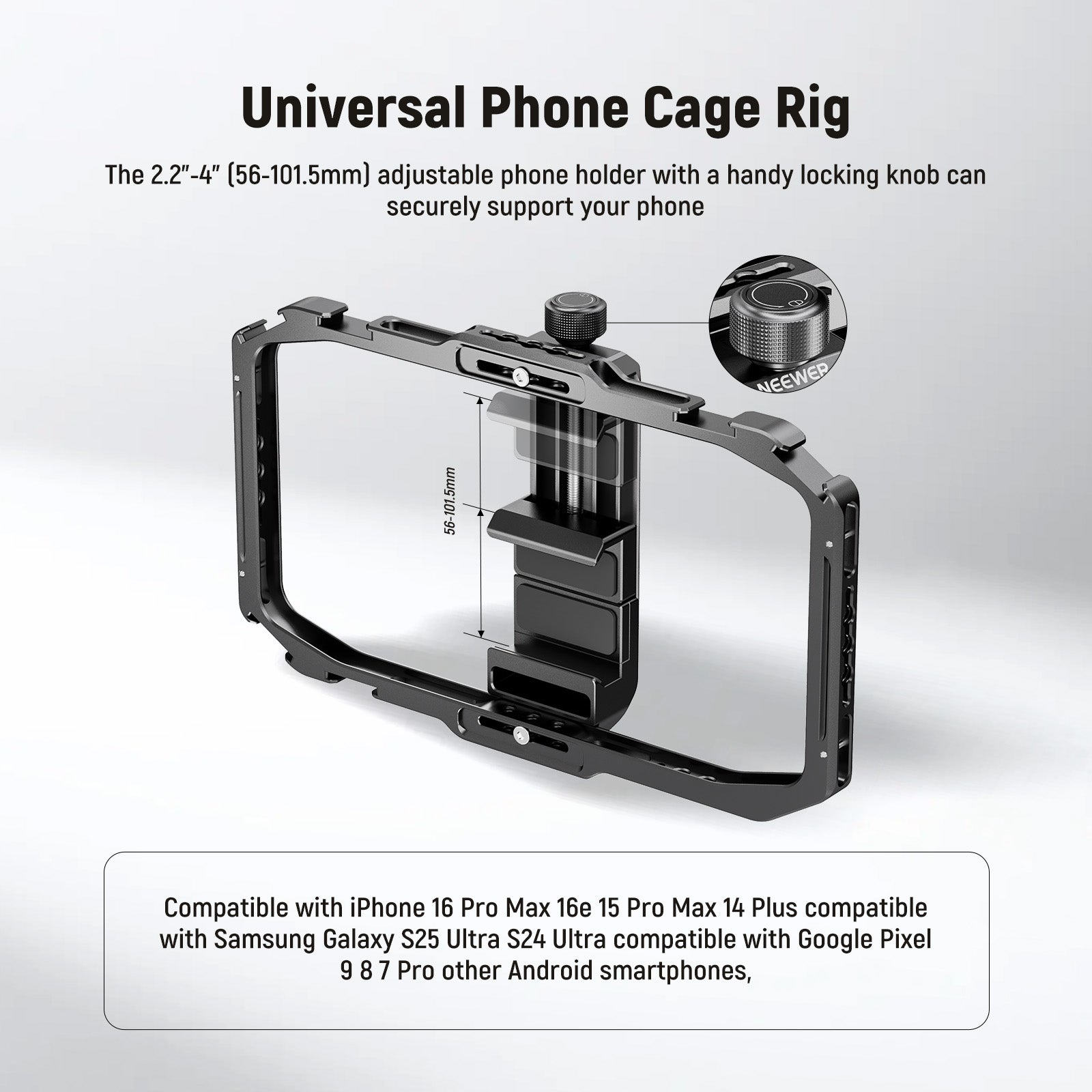 - 【汎用スマホケージリグ】スマホホルダーは2.2"-4"(56-101.5mm)調整可能で、便利なロックノブを備え、お使いの携帯電話をしっかりと支えます。コンパチブ iPhone 16 Pro Max/16e/15 Pro Max/14 Plus/Galaxy S25 Ultra/S24 Ultra/Pixel 9/8/7 Pro。