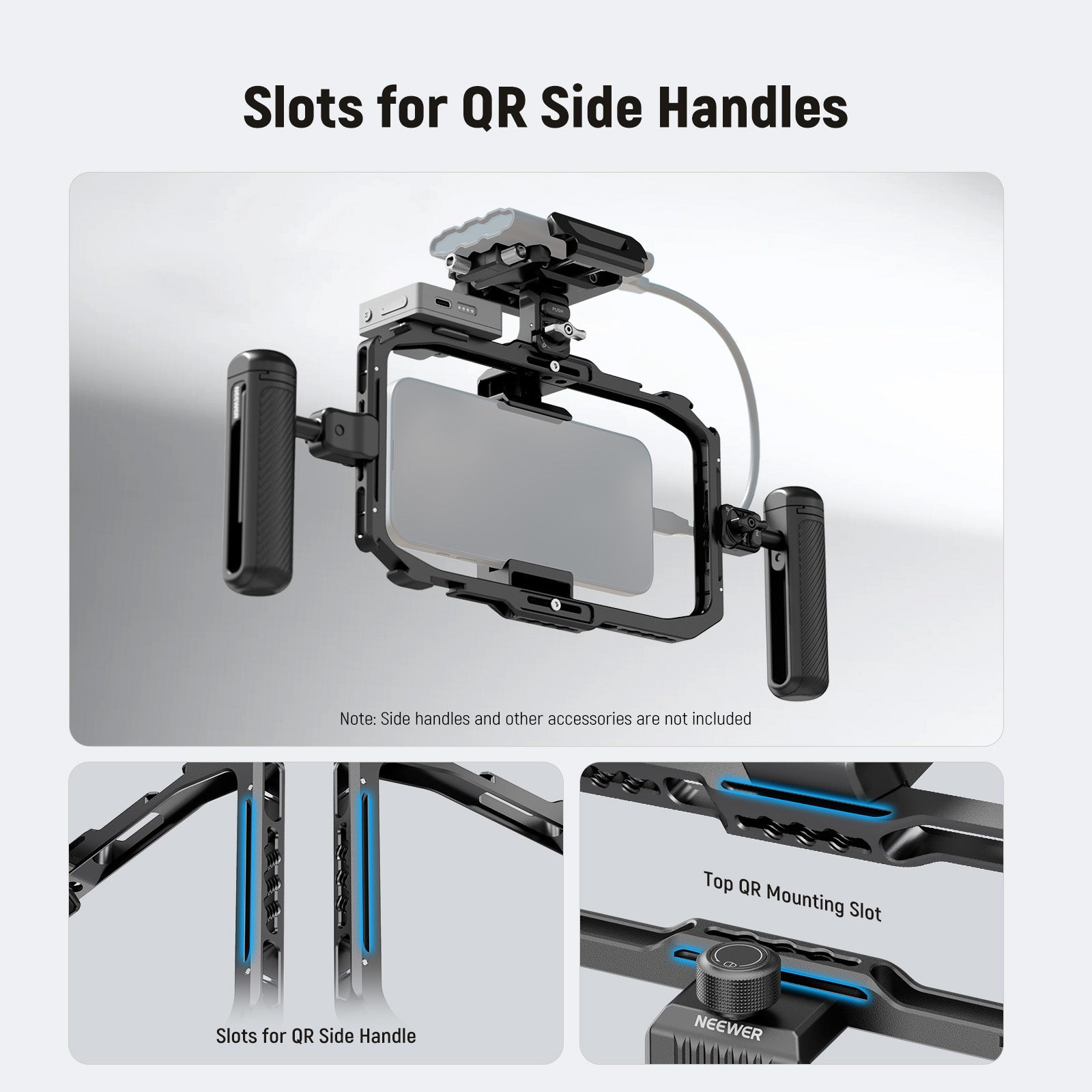 - 【QRサイドハンドル用スロット】ケージの4つ側面には、NEEWER PA045B/PA045S/PA045Eクランプオンクイックリリースサイドハンドルや、PA065クイックリリースSSDホルダーを含み、同じマウントシステムを持つ他のアクセサリー用の専用スロットがあります。ご注意: サイドハンドルおよびその他のアクセサリは付属していません。