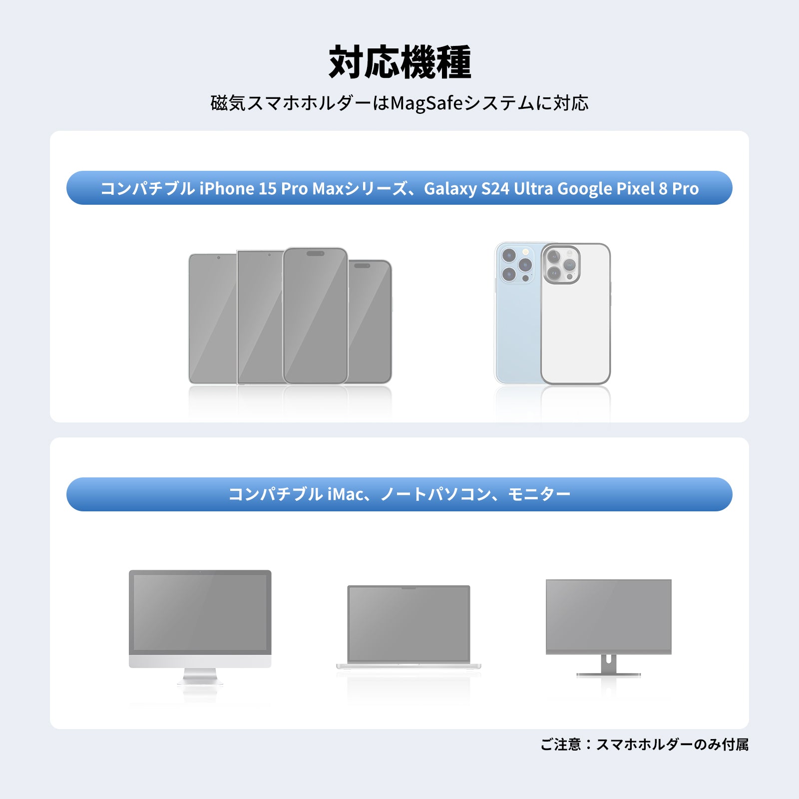 - 【卓上モニター用スマホカメラマウント】連携カメラマウントを使用して、スマホを卓上ディスプレイ、モニター、ノートパソコン、テレビに取り付け、ウェブカメラマウントとして多用途に使用可能、コンパチブル Magsafe iPhoneシリーズ、コンパチブル Andriodスマホ、コンパチブル Macデスクトップやノートパソコン、コンパチブル iMac一体型コンピューター、コンパチブル Apple TV 4Kやその他のスクリーン、FaceTime、ビデオ会議、ライブストリーミング、その他のコンテンツ作成に最適です。
