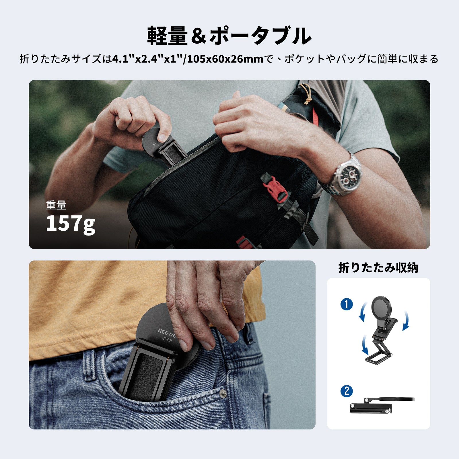 - 【簡単設置とコンパクトな携帯性】引っ張ったり折ったりするだけで、スマホカメラマウントを掛けモードから卓上モードに切り替え、カメラマンやビデオグラファーの多様なニーズに応えます。全金属製スマホホルダーは黒色陽極酸化アルミ合金で作られ、重さわずか157gで、磨耗や破損に耐える頑丈な作りになっています。カメラマウントは4.1"x2.4"x1"/105x60x26mmに折りたため、ポケットに入れて持ち運びが簡単で、様々な撮影場所に適用します。