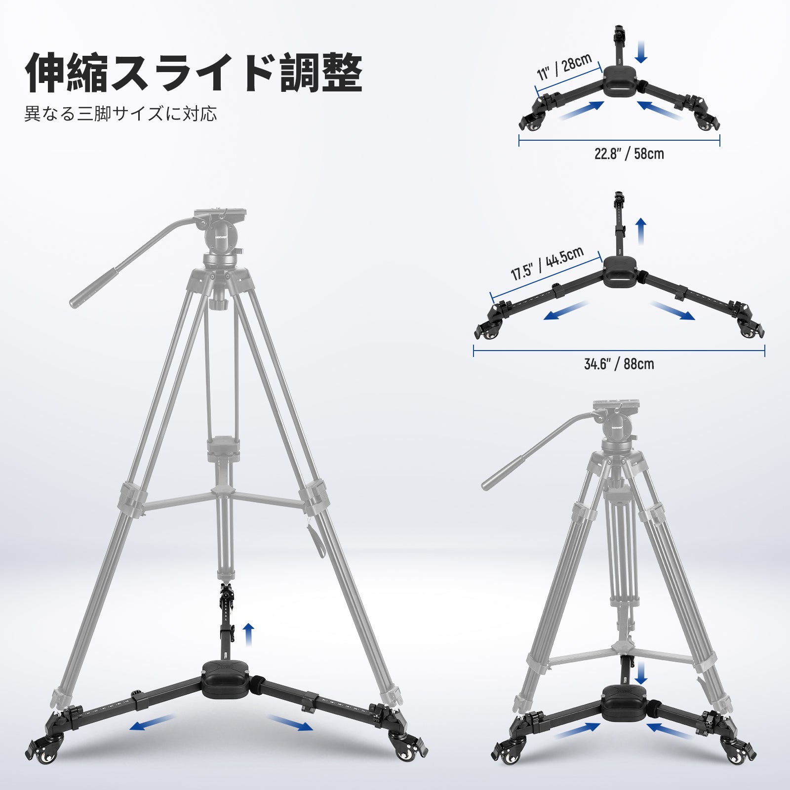 - 【伸縮&スライド調整】ビデオ三脚ドリーは直径11"/28cmから17.5"/44.5cmまで伸縮可能で、異なる三脚サイズや開口角度に対応し、狭いスタジオスペースや広大な屋外ロケへの適応性を高めます。