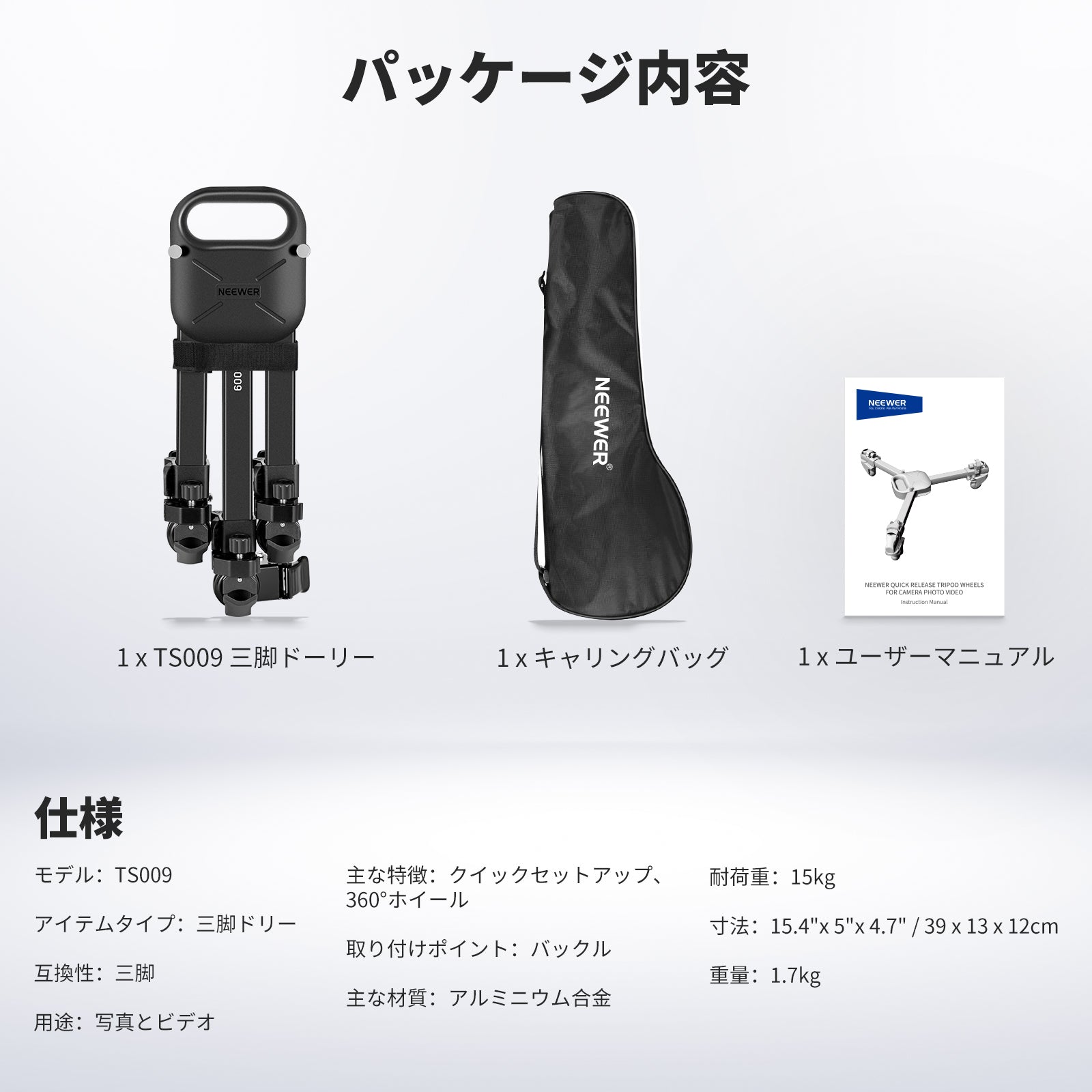 - 【頑丈な写真撮影用三脚ドリー】TS009三脚ドリーはアルミ合金で作られ、車輪付き、最大15kgまでサポートし、三脚やその他のマウントデバイスに安定性、機動性、利便性を提供し、スタジオでも野外でもブレのないスムーズな撮影を可能にし、写真撮影、撮影、ビデオ録画などの移動式または移動式の三脚スタンドとして多用途に使用できます。