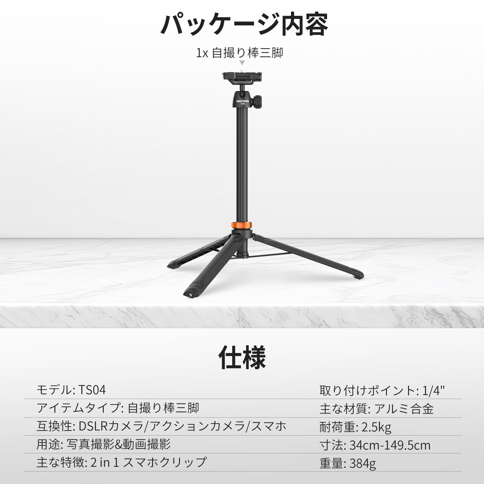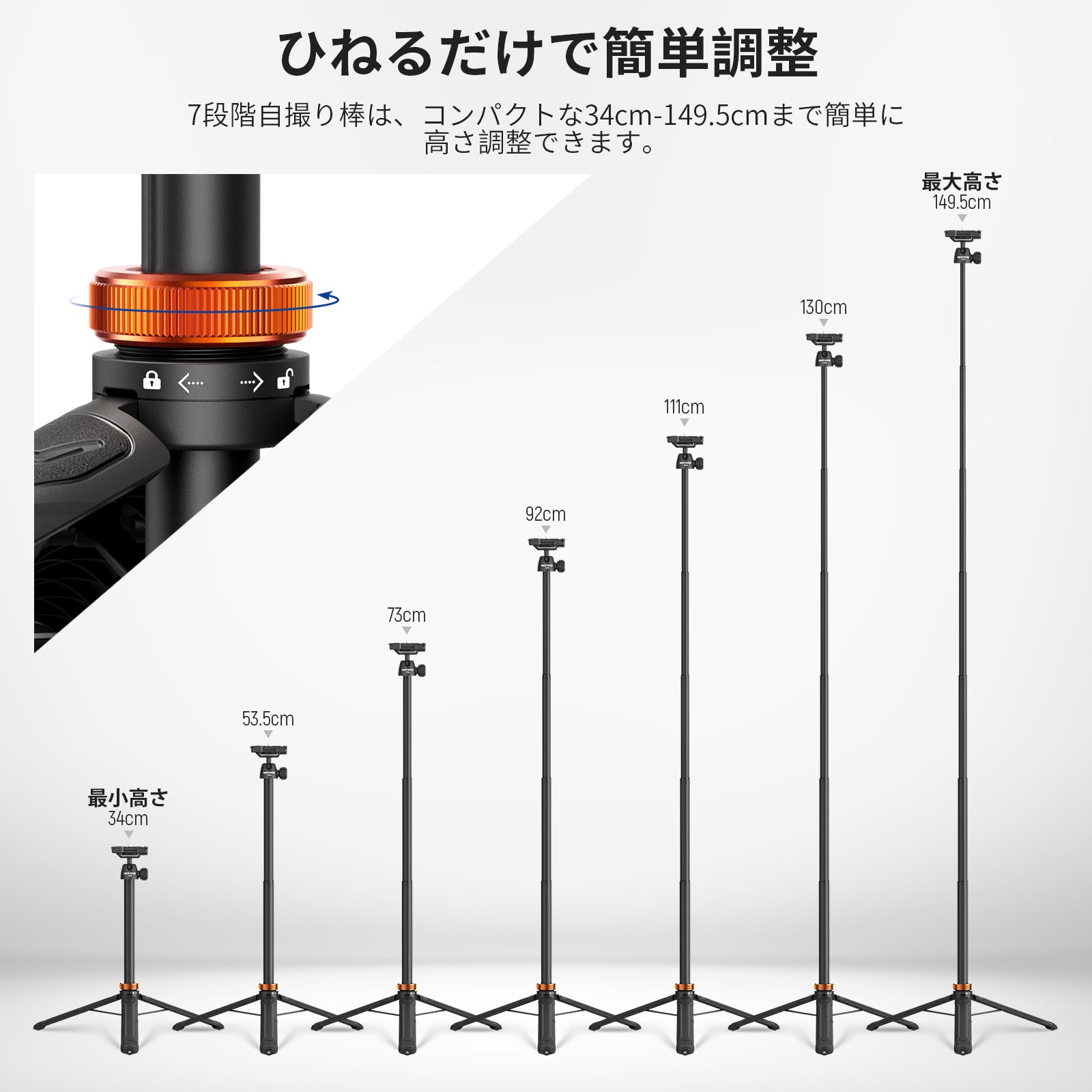 - 【360°ボールヘッド&素早く高さ調整】7段自撮り棒卓上三脚は、ロックリングを回すだけで、34cm-149.5cmの高さを調整できます。さらに、自撮り棒三脚は、Uノッチ付きの金属製ボールヘッドを搭載しており、360°回転と90°垂直撮影が可能で、縦向きと横向きのモードを素早く切り替えます。