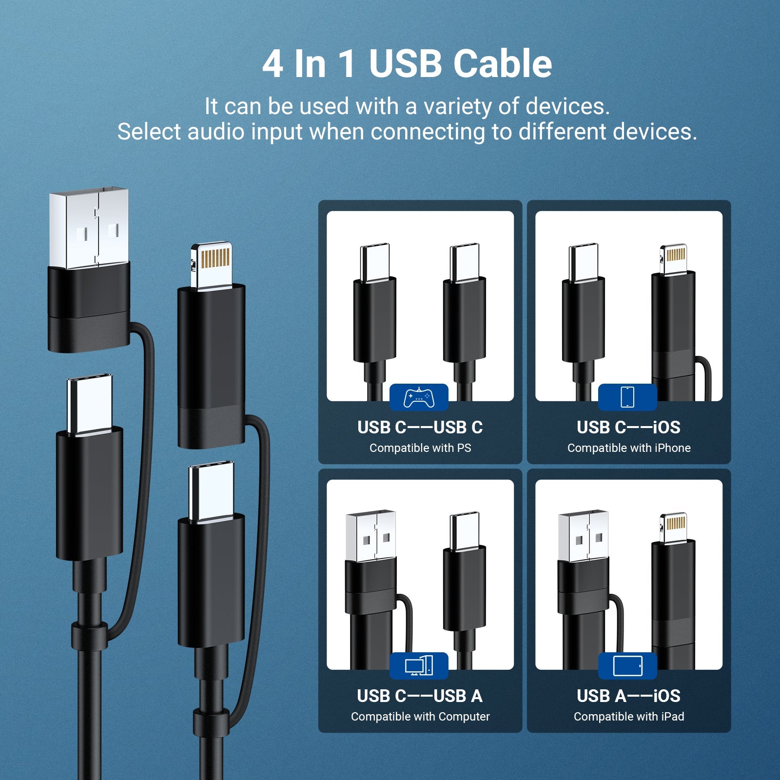 - 【プラグアンドプレイマイク】付属4 in 1 USBケーブル(USB C、USB A、iOSコネクタ)でパソコン/ノートパソコンに接続すれば、すぐに音声を拾え、ドライバーは不要です。macOS、Windows PC、iPhone、Androidに対応し、ビデオ会議、オンライン授業、ズームコール、ゲームチャット、ポッドキャストなど、様々な用途にご利用いただけます。ご注意: 複数オーディオデバイスをパソコンに接続している場合は、UM04外部マイクをデフォルト入力デバイスに設定してください。一部スマホ(OPPO、VIVOなど)では、OTG機能の有効化が必要な場合があります。