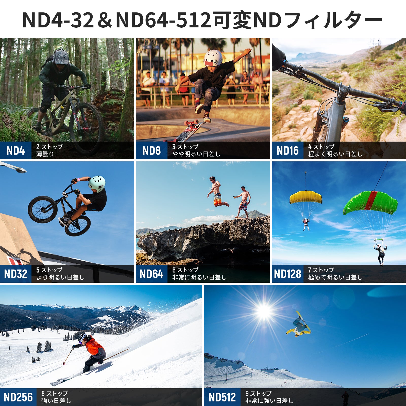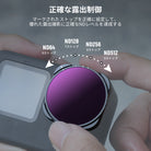 - 【可変で正確な光制御】両端のハードストップはND4とND32(2ストップと5ストップ)またはND64とND512(6ストップと9ストップ)の間で中性密度が制限されます。アクションカメラレンズフィルターを正確にマークされたストップまで回転させるだけで、必要な光量削減レベルを達成して正確な露出制御を実現し、動きのある被写体を表現力豊かなモーション ブラー効果で撮影できます。