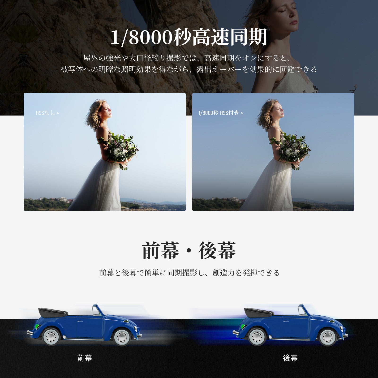 - 【複数モードと1/8000s HSS】スピードライトフラッシュは、TTL(自動)、M(手動)、およびRPT(ストロボ)モードを提供します。TTLモードは±3(19レベル)の露出補正をサポートし、Mモードは1/256-1/1(81レベル)の出力調整とS1/S2光スレーブをサポートし、RPTモードでは199Hzで最大100回のストロボフラッシュが可能です。1/8000s HSS、先幕/後幕シンクロ、FEC/FEB(フラッシュ露出補正/ブラケット)も利用可能です。