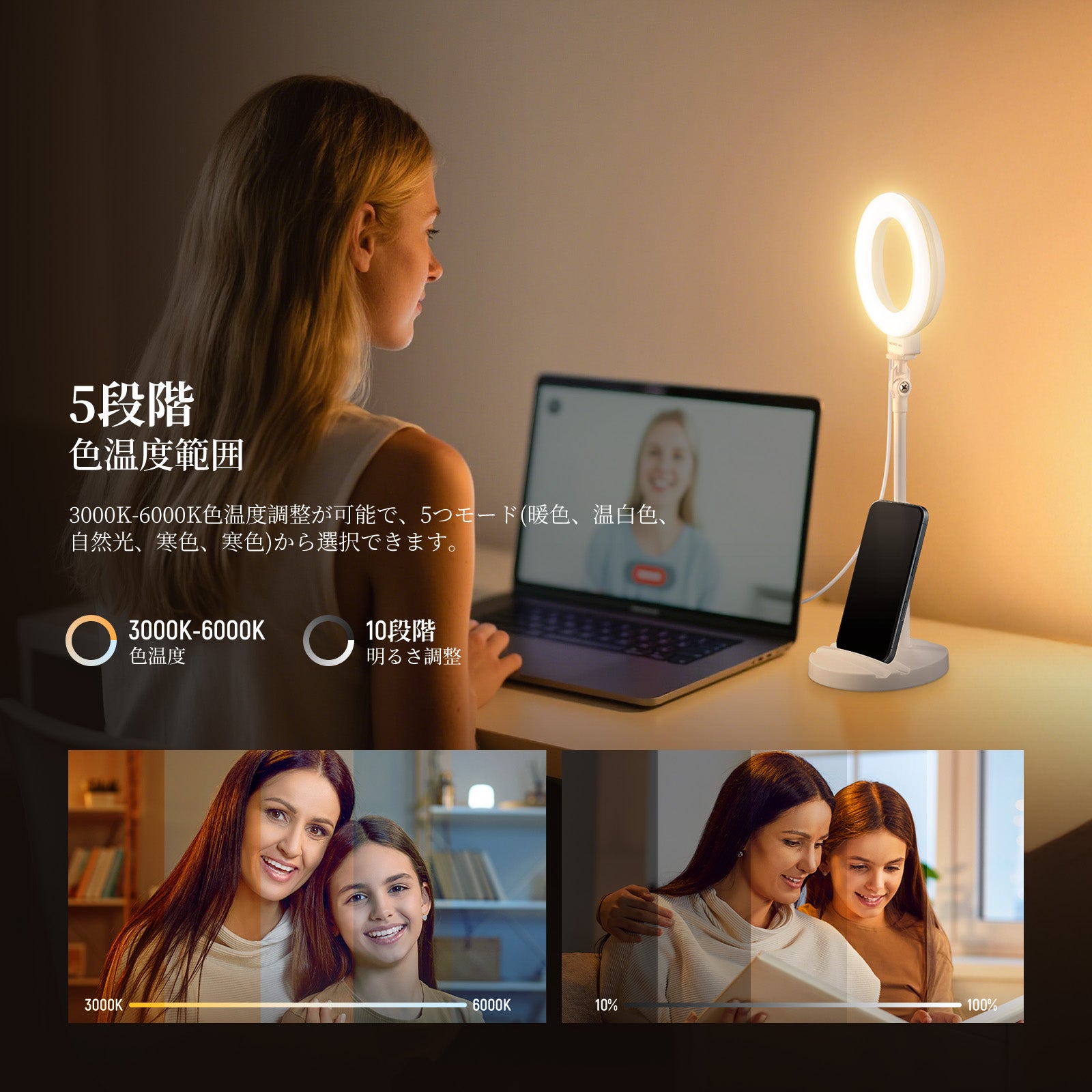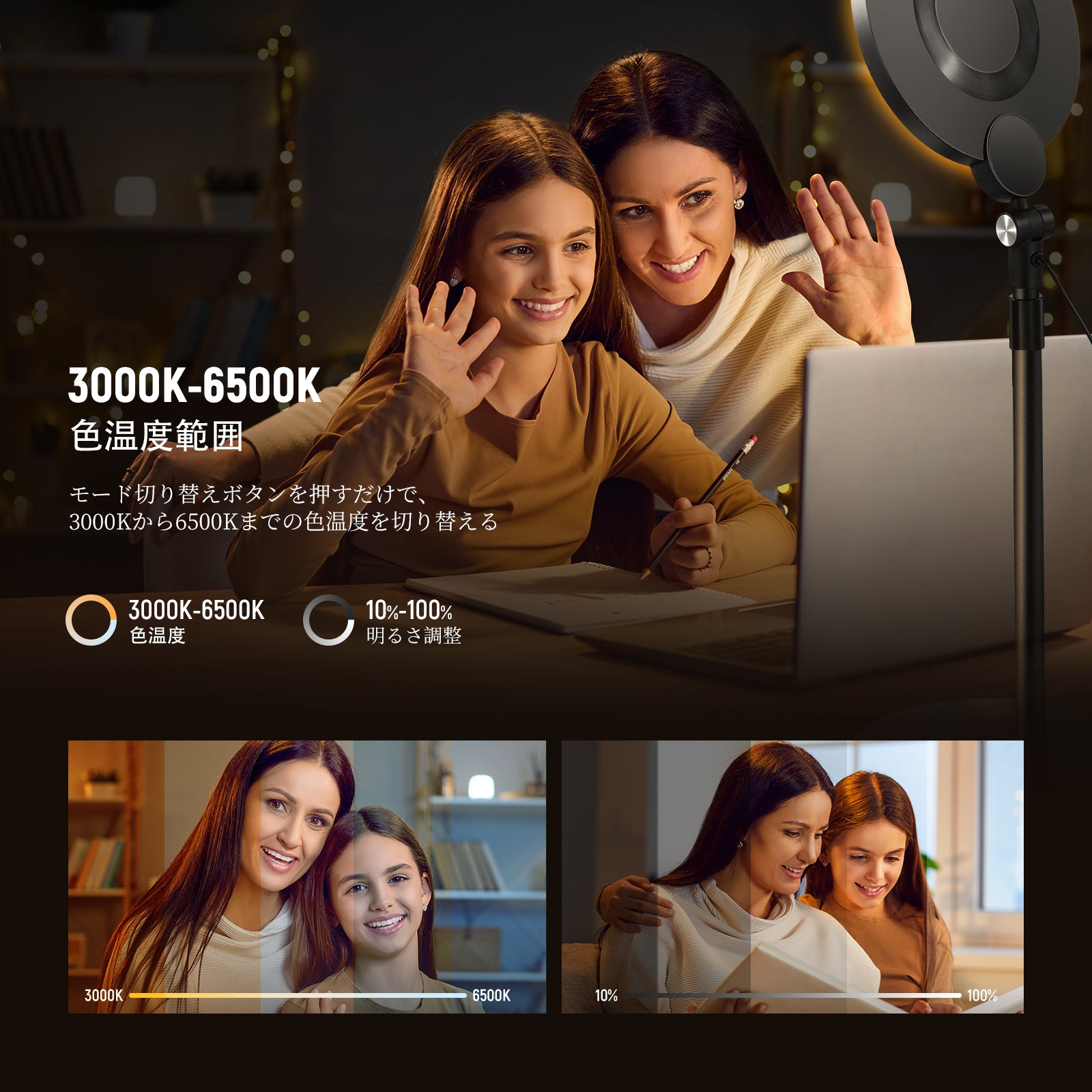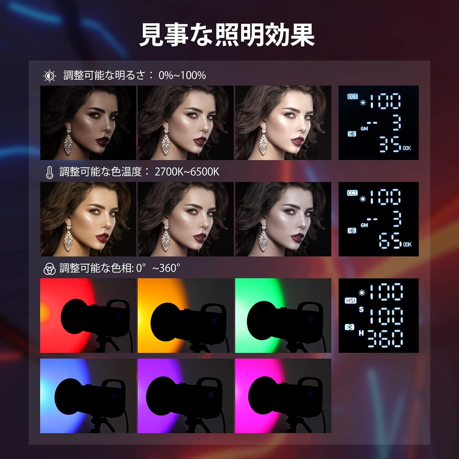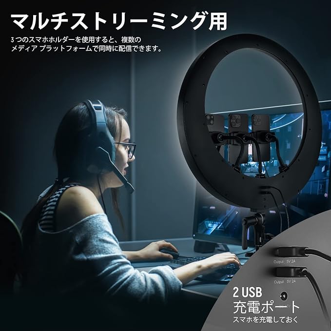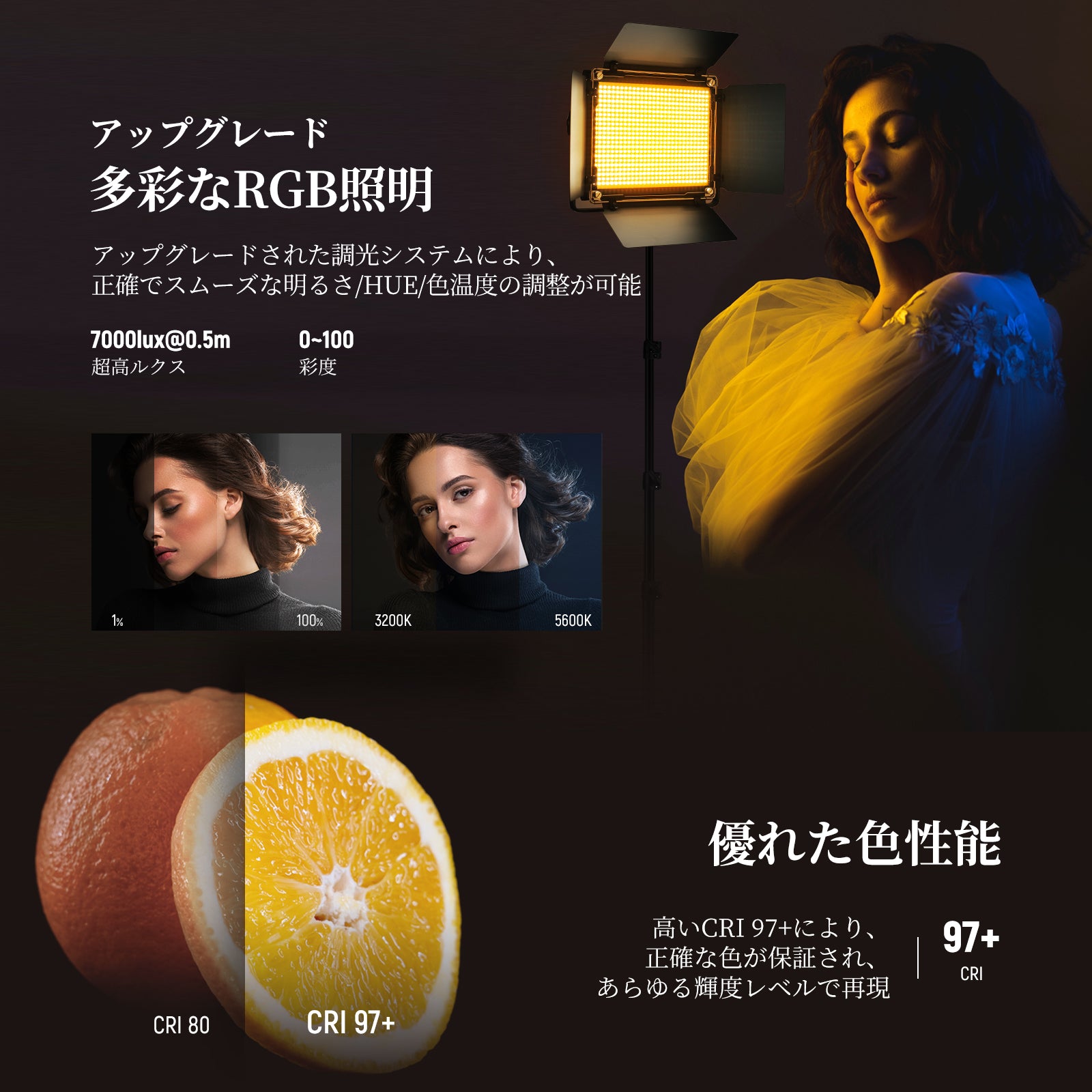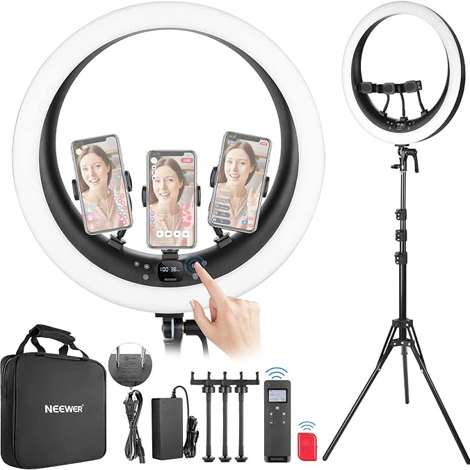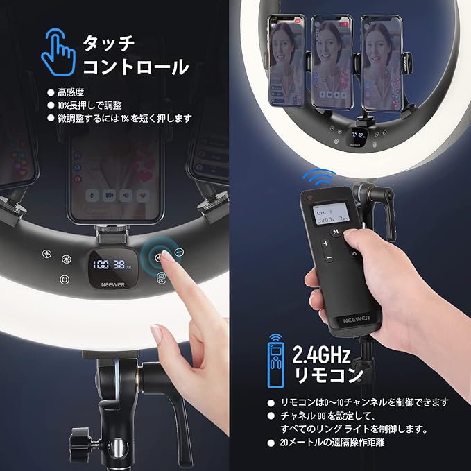 3200K~5600Kの色温度、0~100%の調光範囲、97+の高いCRI、21Wの電力、105個の暖色LED、および105個の冷色 LED を備えています。YouTubeのビデオ録画、ビデオブログ、ゲーム、ライブストリーミング、ポートレート、製品の写真撮影に最適です。