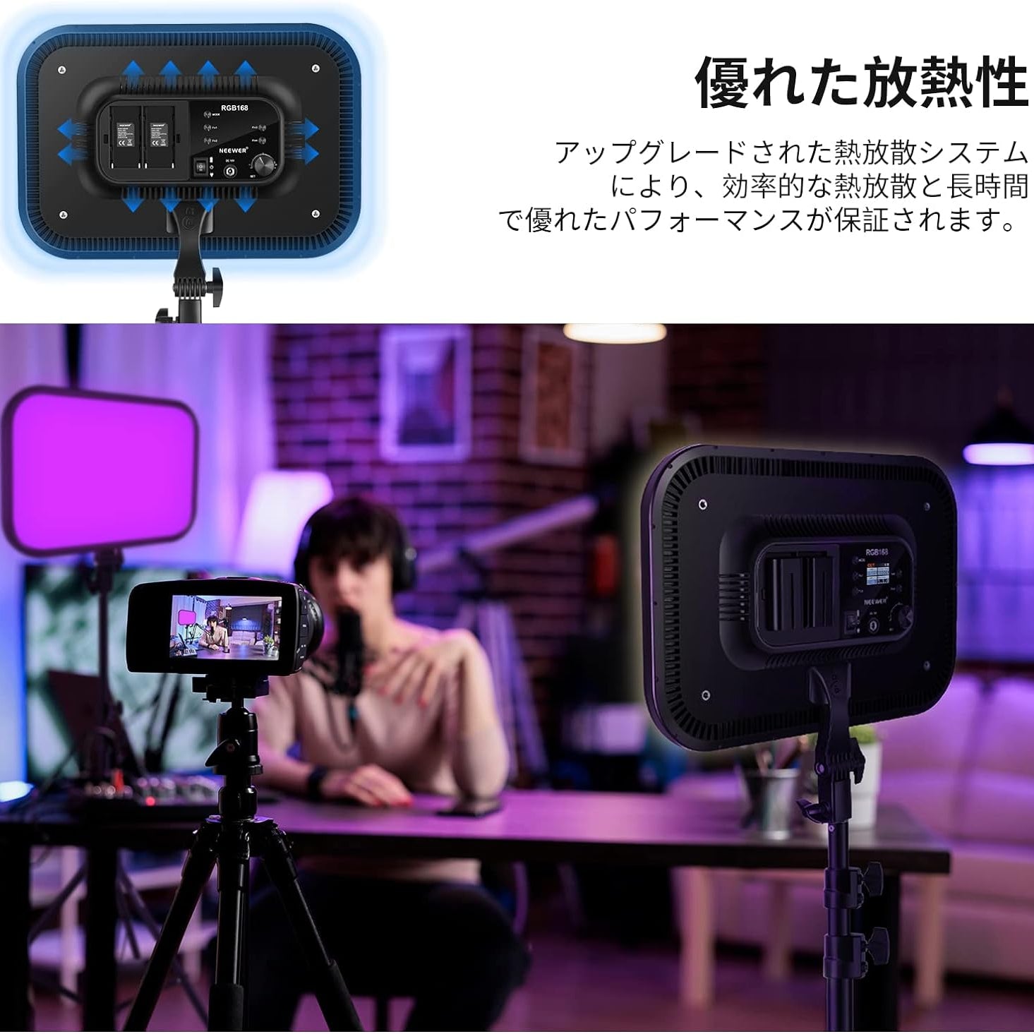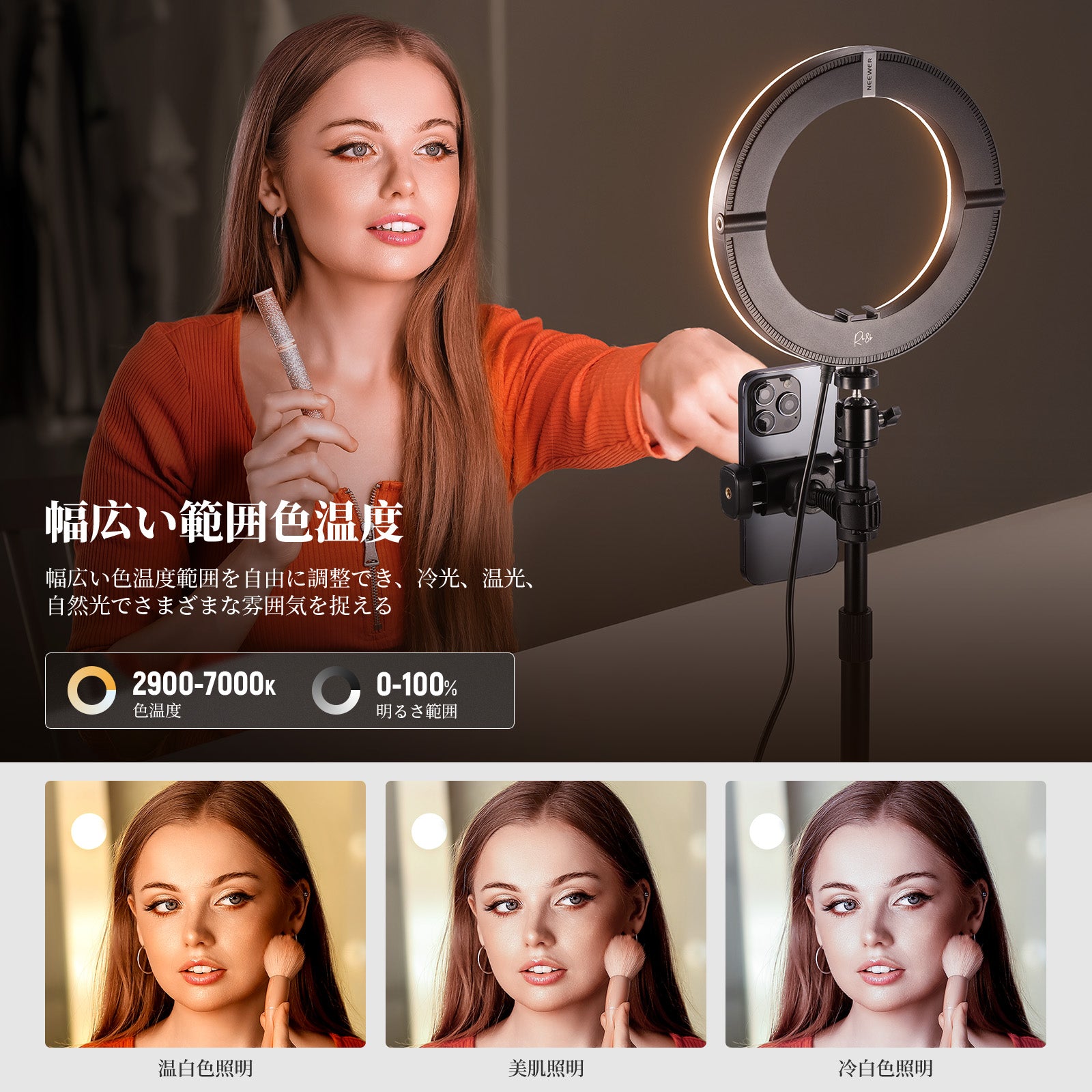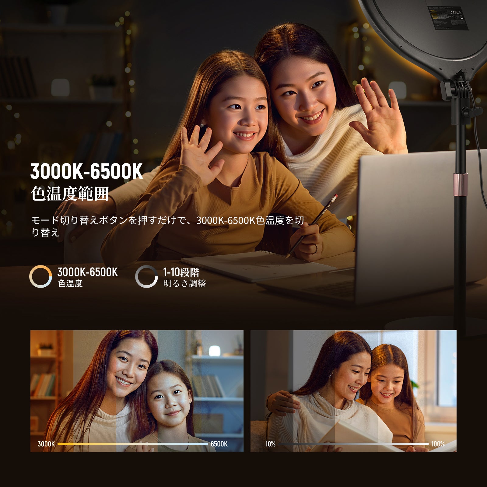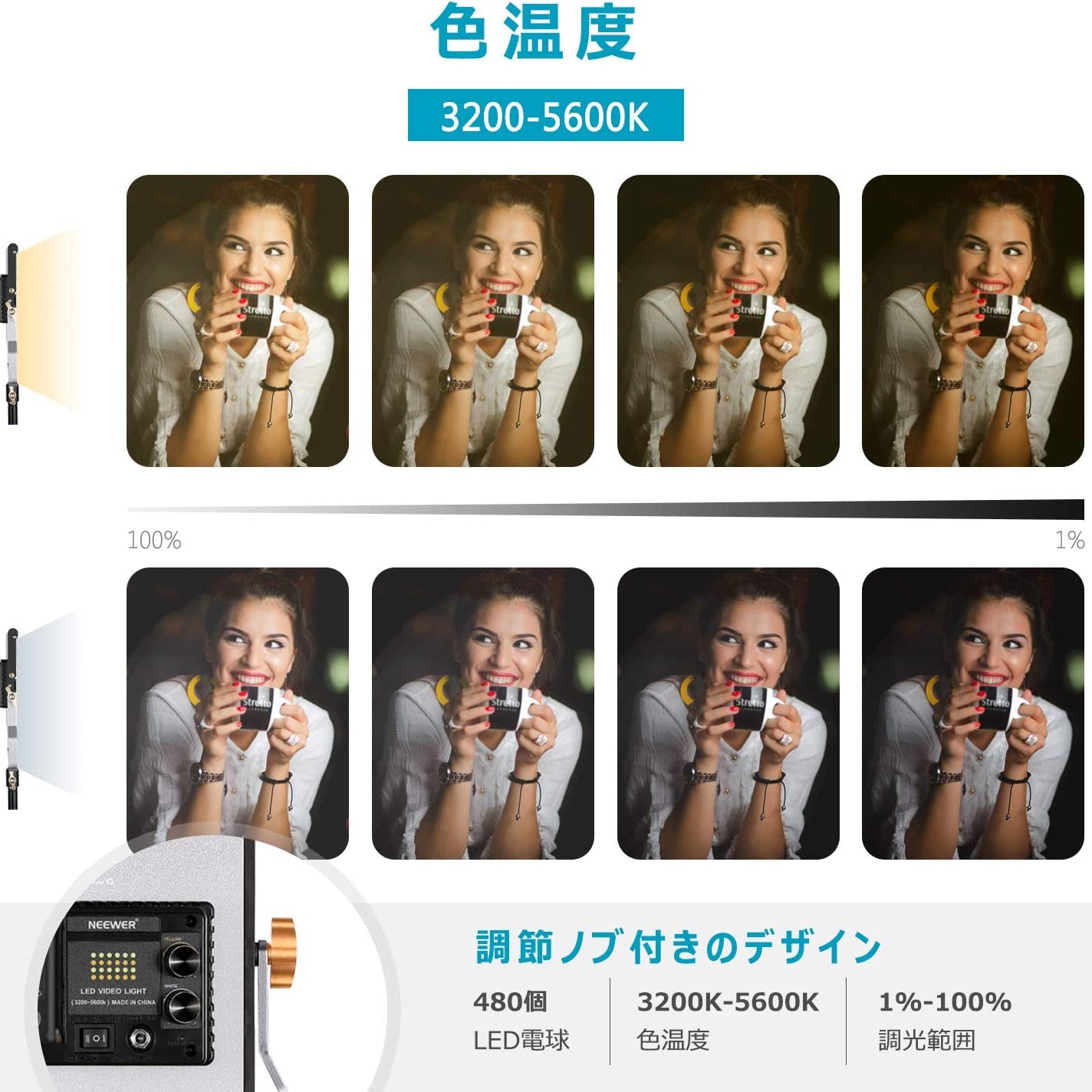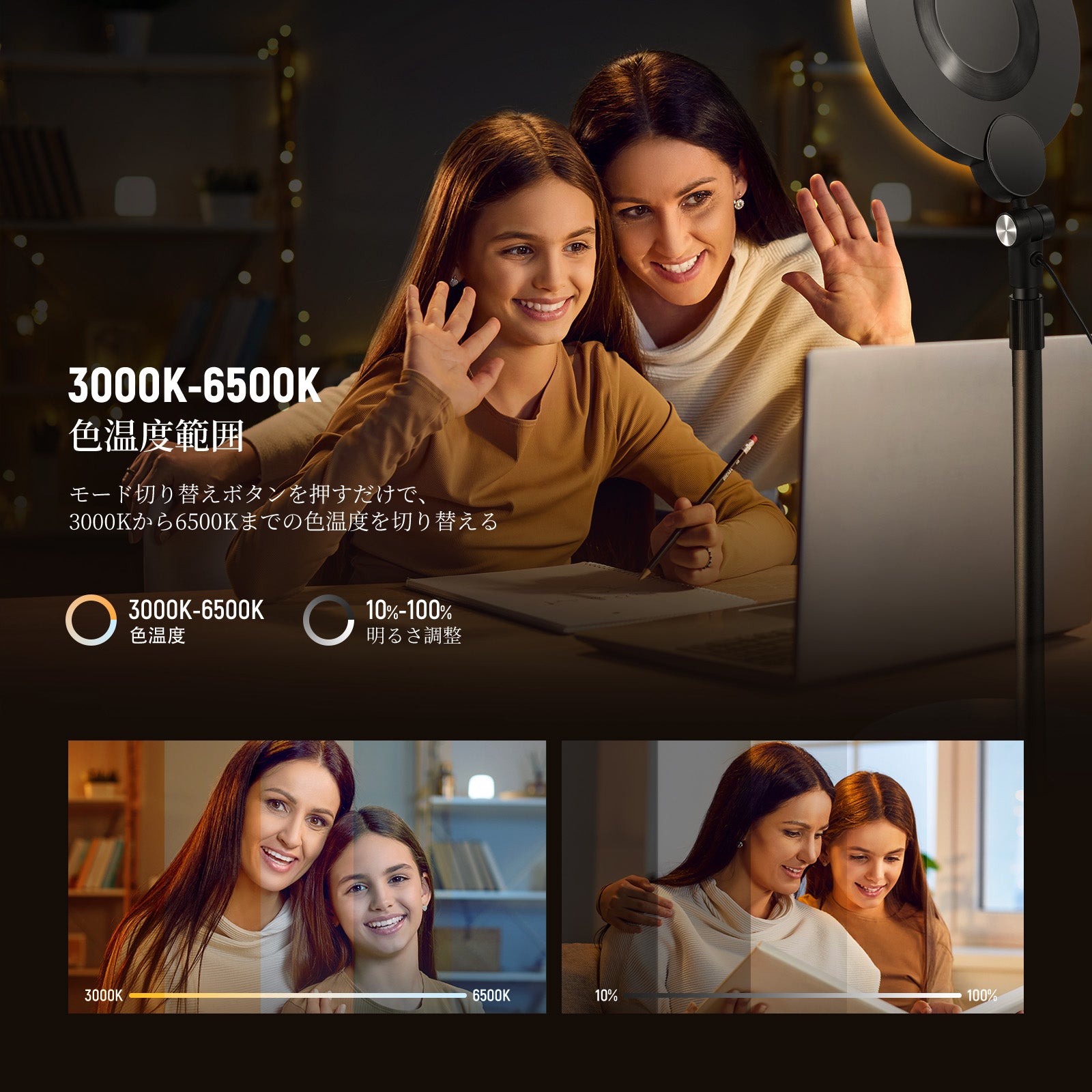 3200K~5600Kの色温度、0~100%の調光範囲、97+の高いCRI、21Wの電力、105個の暖色LED、および105個の冷色 LED を備えています。YouTubeのビデオ録画、ビデオブログ、ゲーム、ライブストリーミング、ポートレート、製品の写真撮影に最適です。