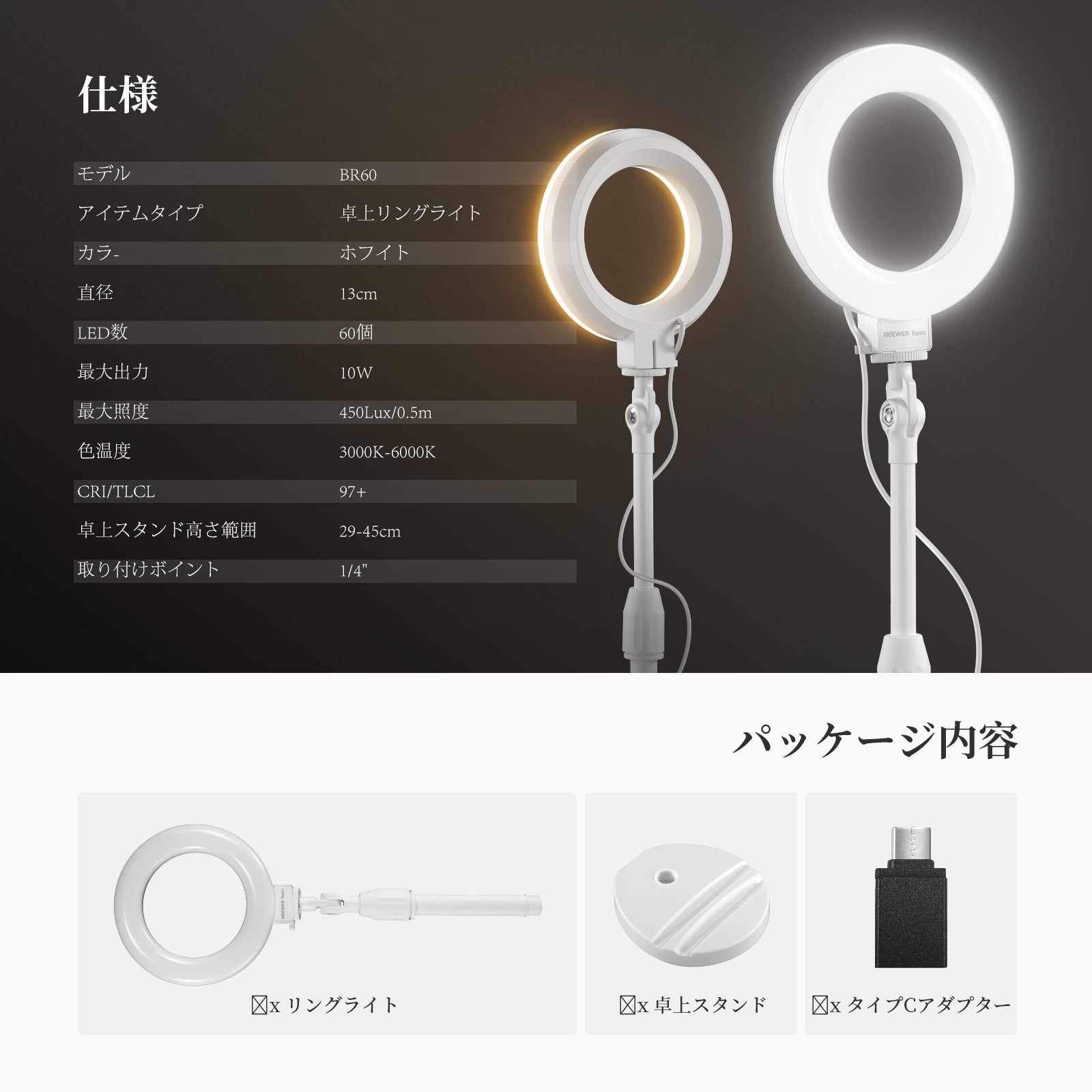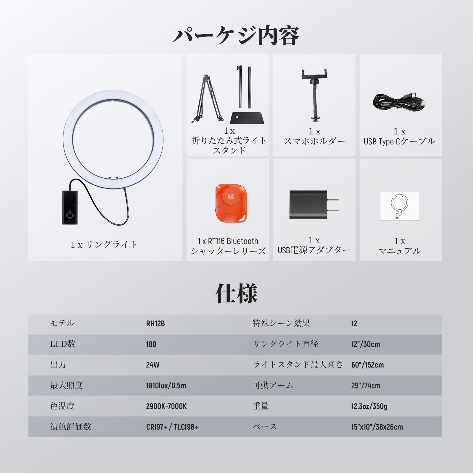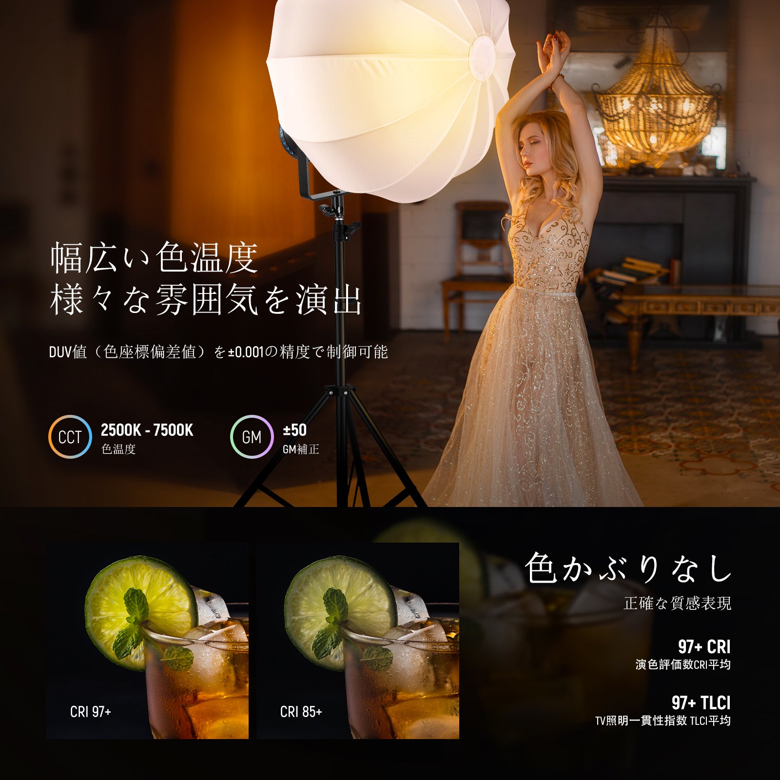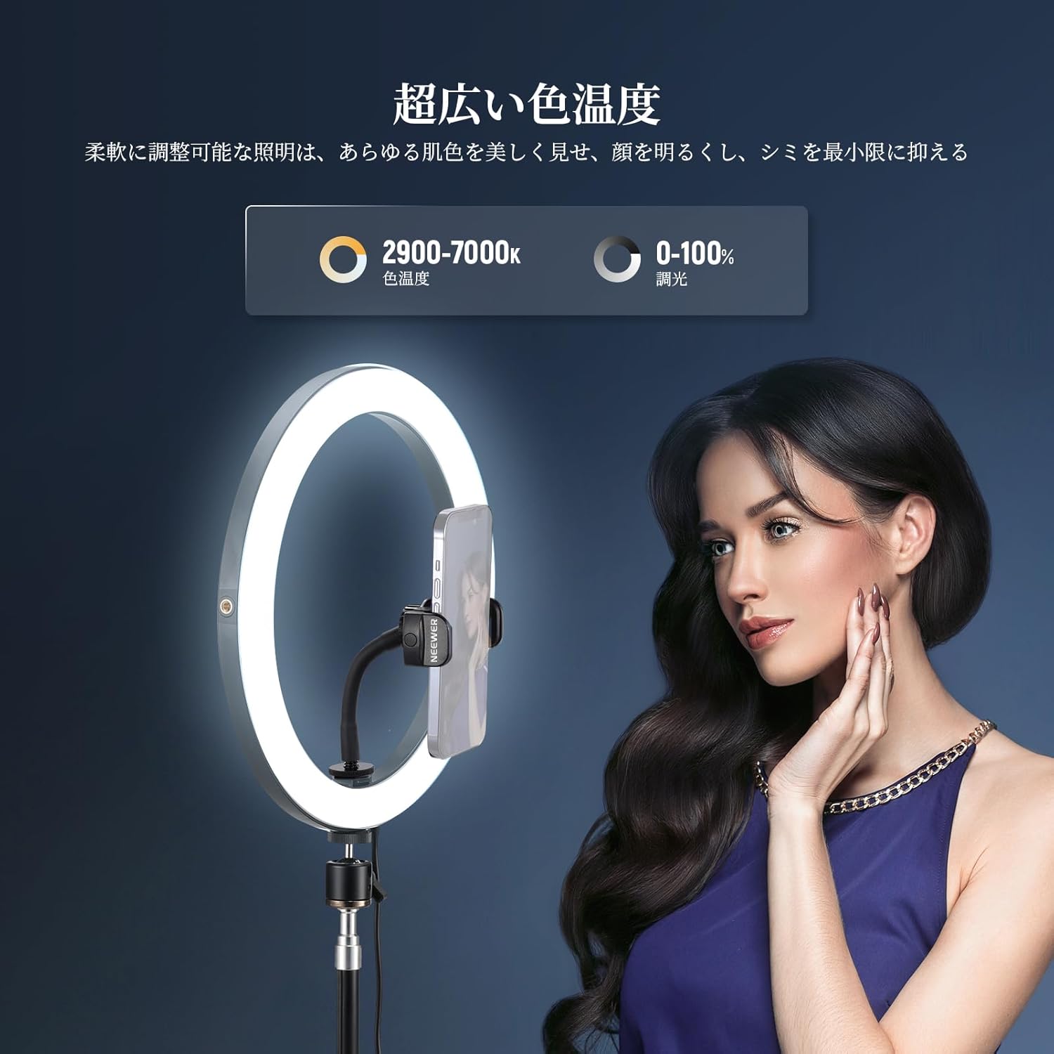 3200K~5600Kの色温度、0~100%の調光範囲、97+の高いCRI、21Wの電力、105個の暖色LED、および105個の冷色 LED を備えています。YouTubeのビデオ録画、ビデオブログ、ゲーム、ライブストリーミング、ポートレート、製品の写真撮影に最適です。