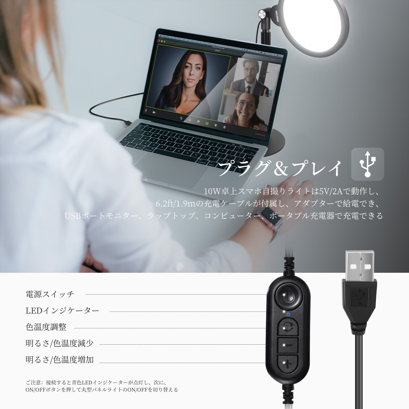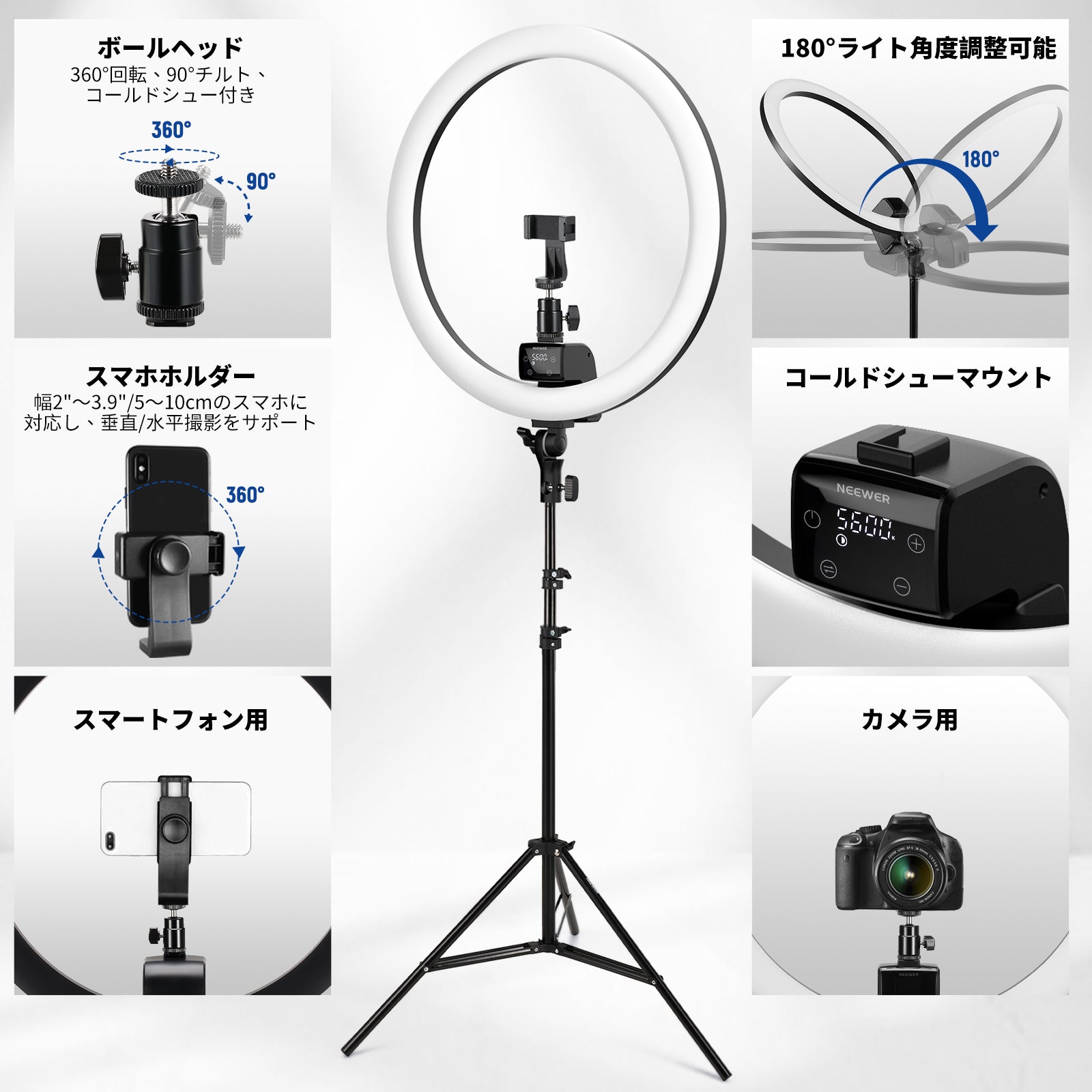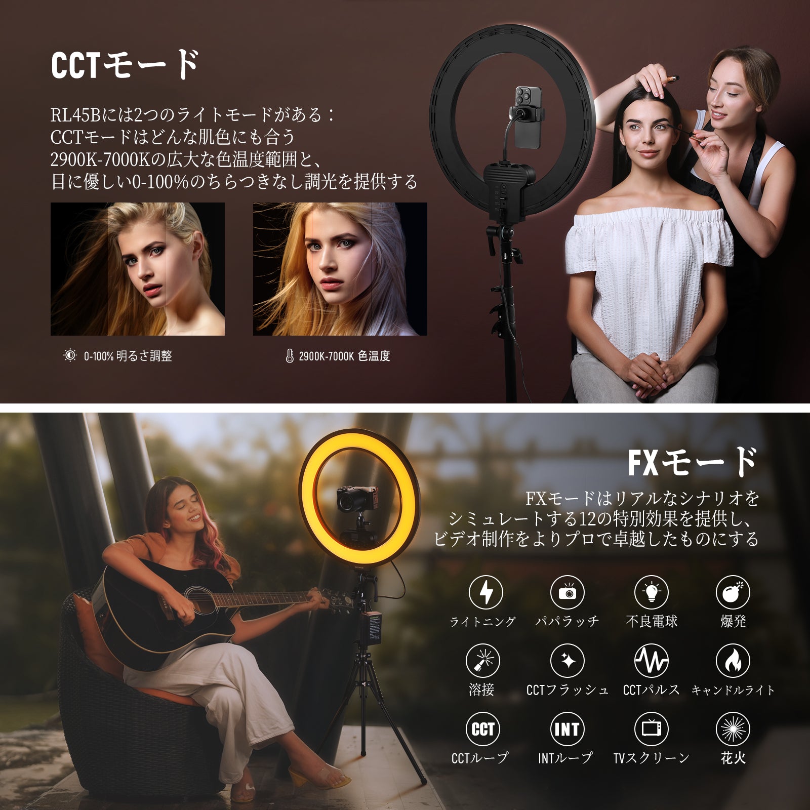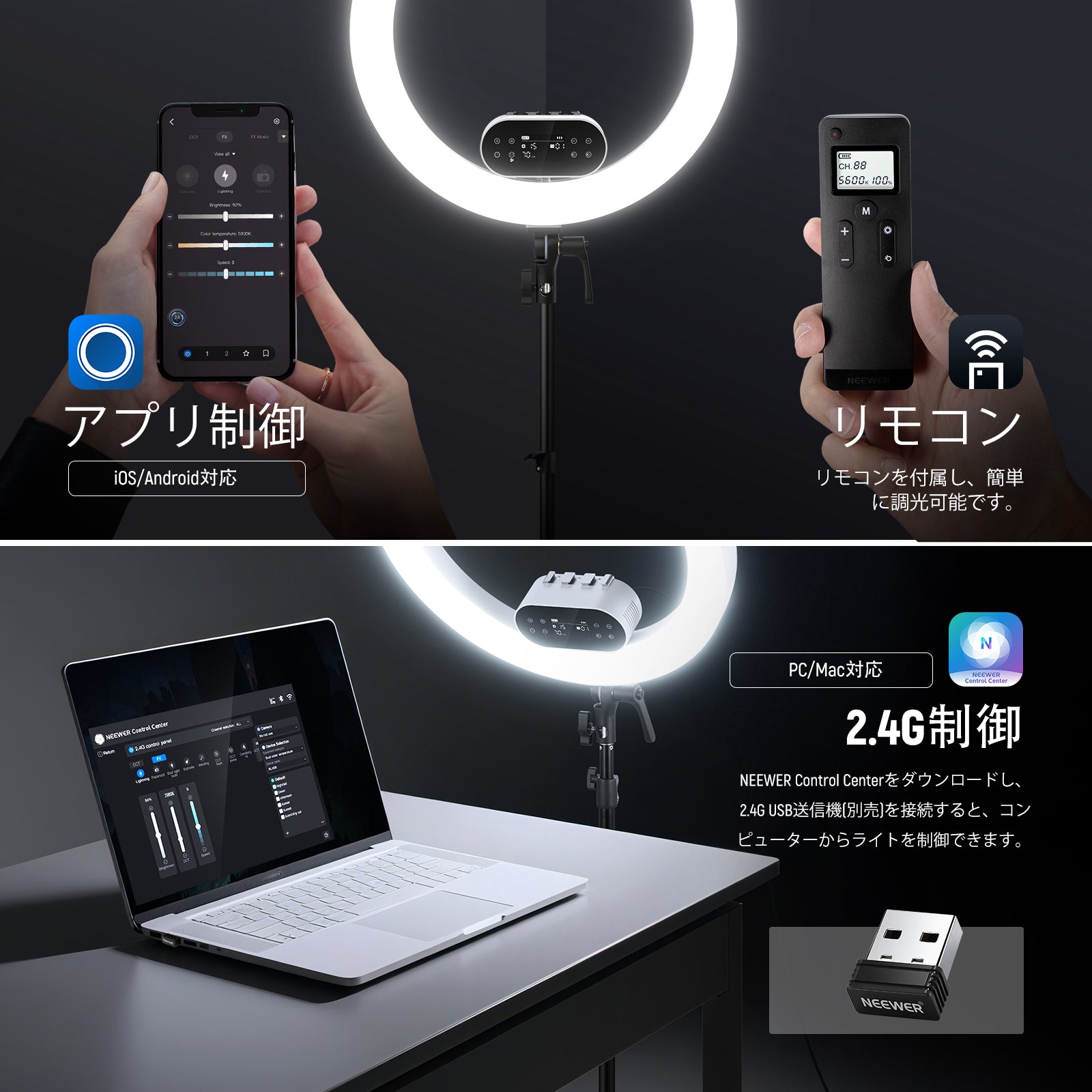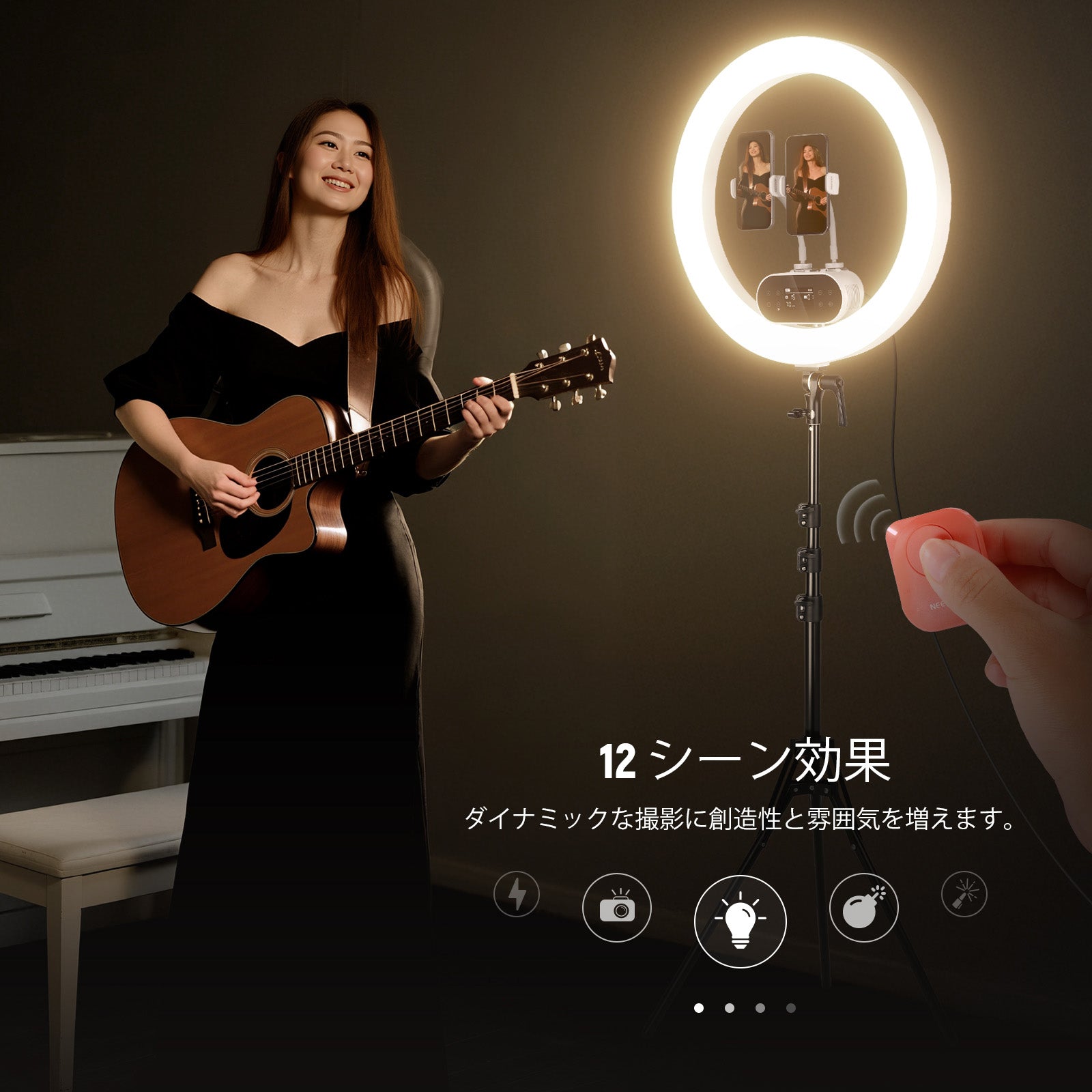3200K~5600Kの色温度、0~100%の調光範囲、97+の高いCRI、21Wの電力、105個の暖色LED、および105個の冷色 LED を備えています。YouTubeのビデオ録画、ビデオブログ、ゲーム、ライブストリーミング、ポートレート、製品の写真撮影に最適です。
