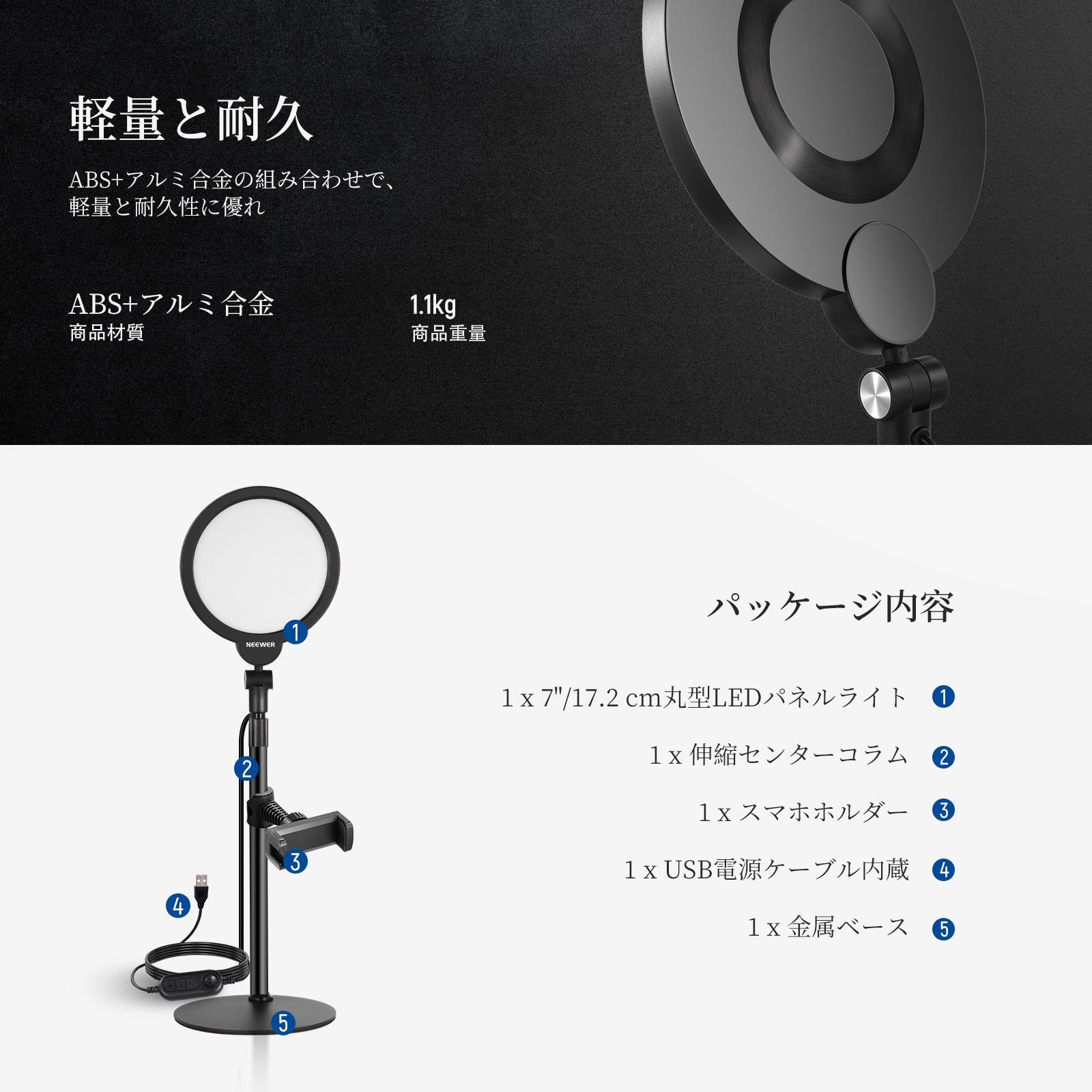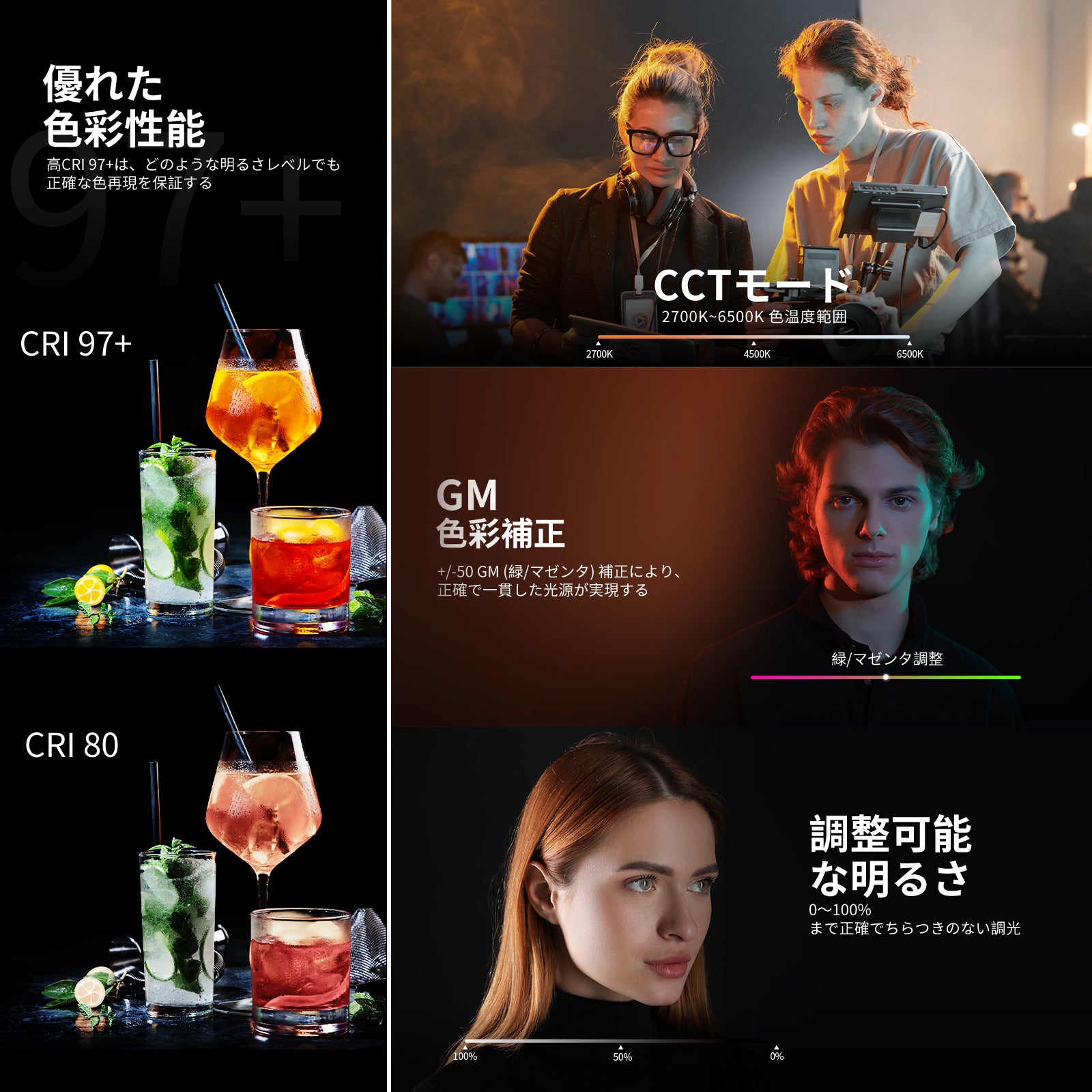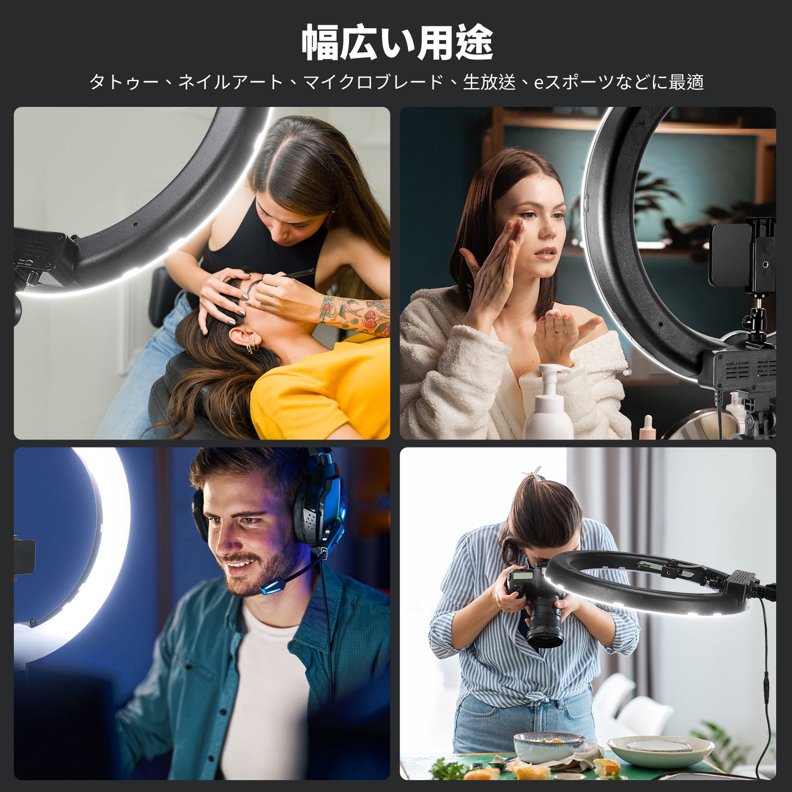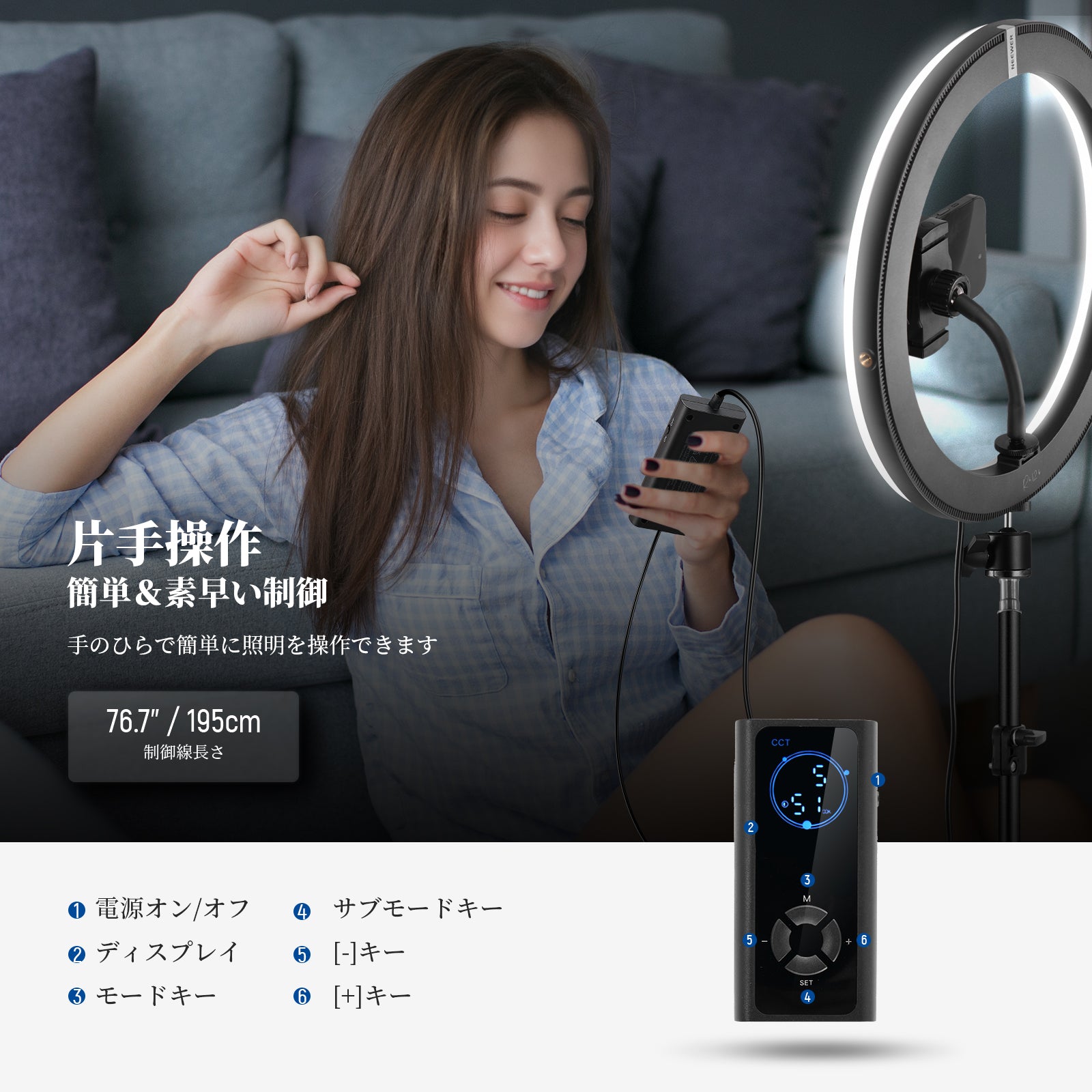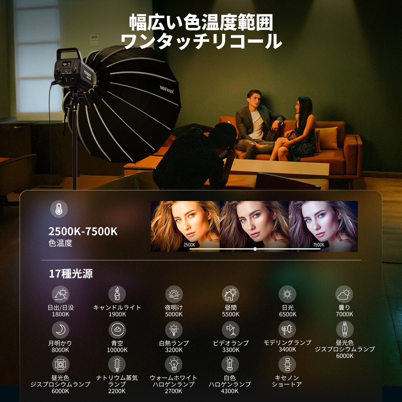 3200K~5600Kの色温度、0~100%の調光範囲、97+の高いCRI、21Wの電力、105個の暖色LED、および105個の冷色 LED を備えています。YouTubeのビデオ録画、ビデオブログ、ゲーム、ライブストリーミング、ポートレート、製品の写真撮影に最適です。