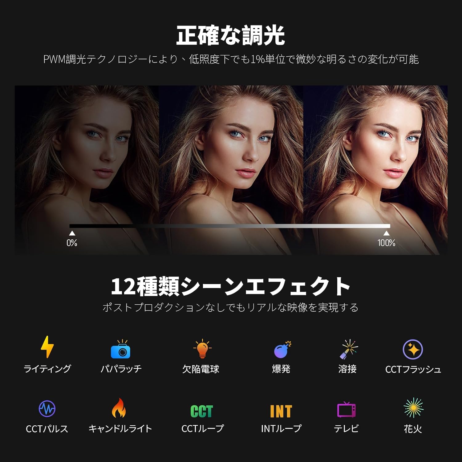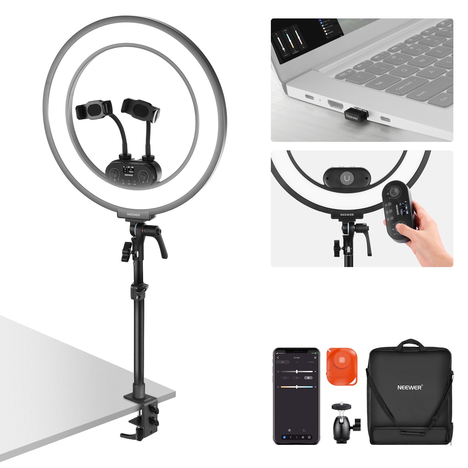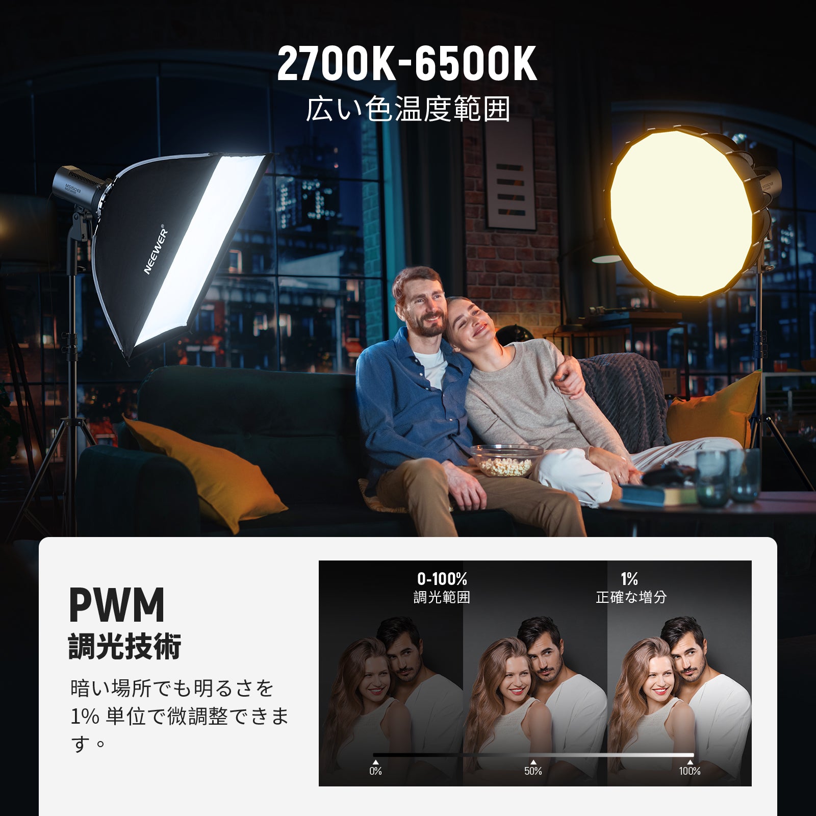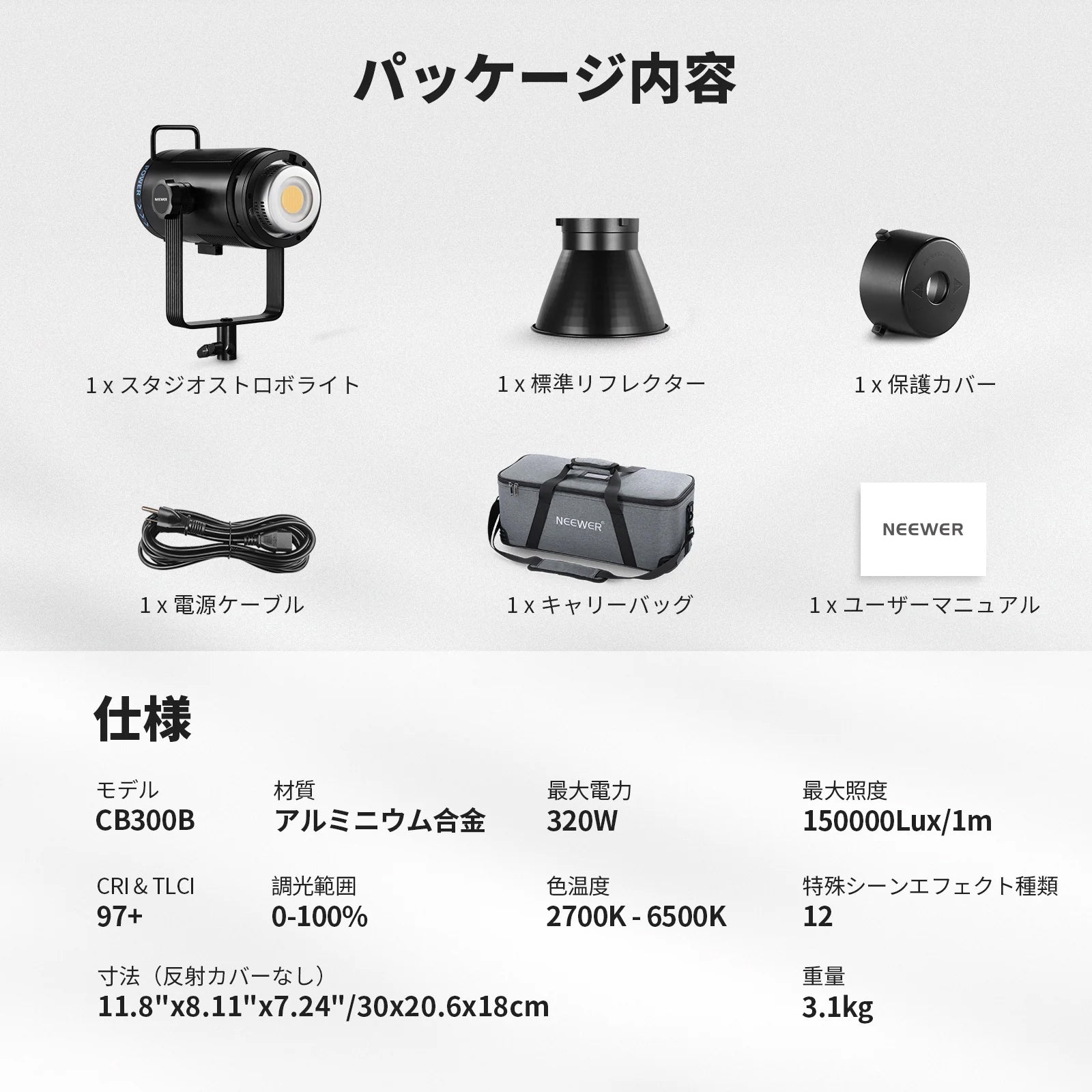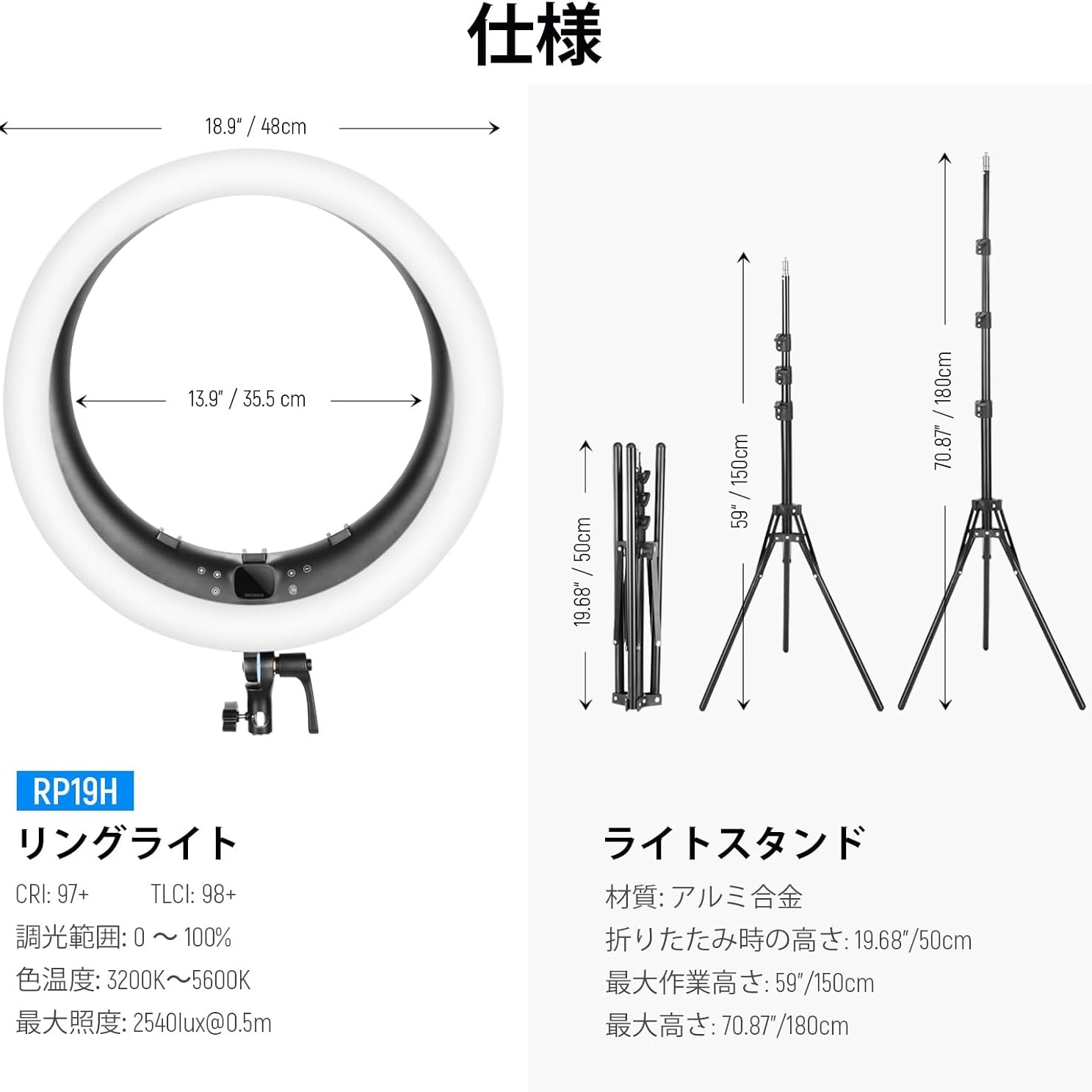 3200K~5600Kの色温度、0~100%の調光範囲、97+の高いCRI、21Wの電力、105個の暖色LED、および105個の冷色 LED を備えています。YouTubeのビデオ録画、ビデオブログ、ゲーム、ライブストリーミング、ポートレート、製品の写真撮影に最適です。