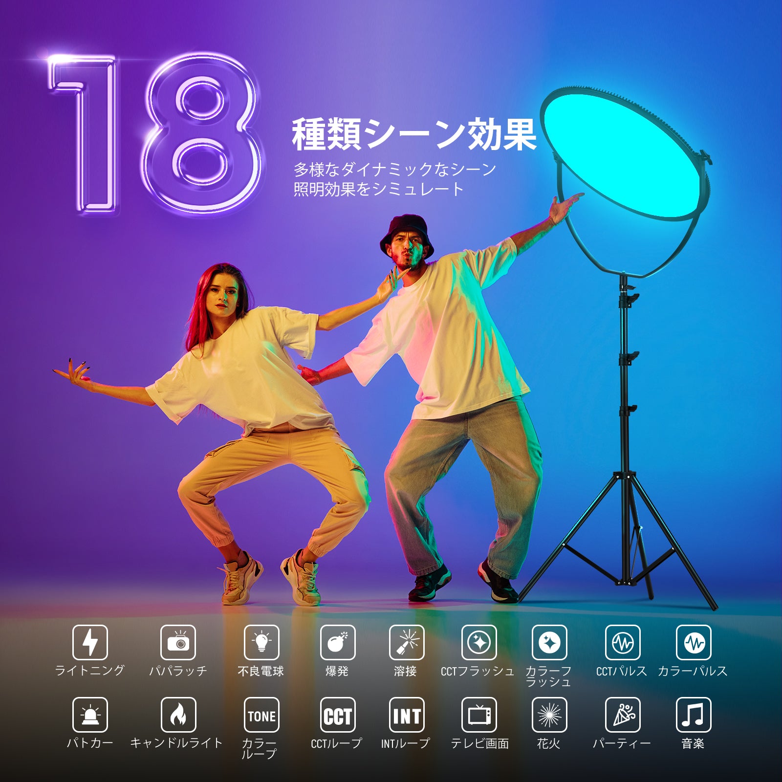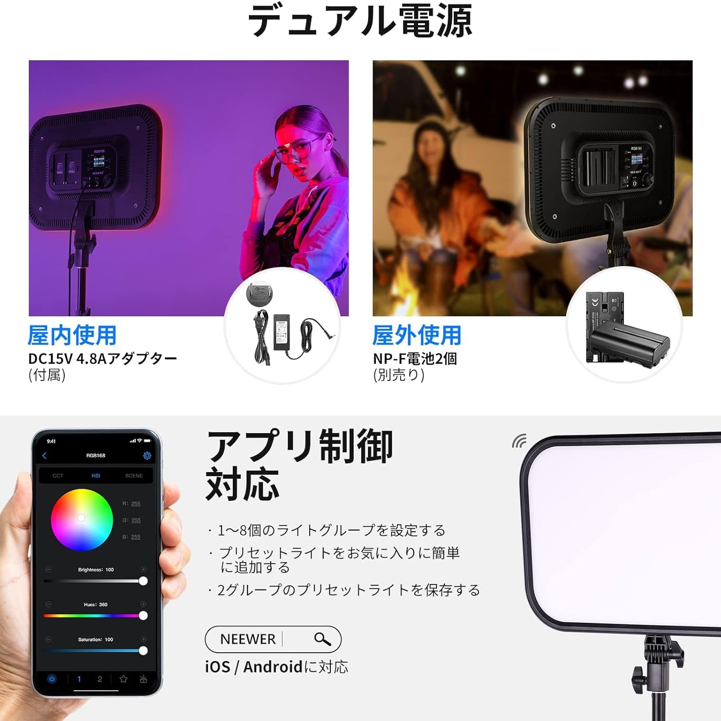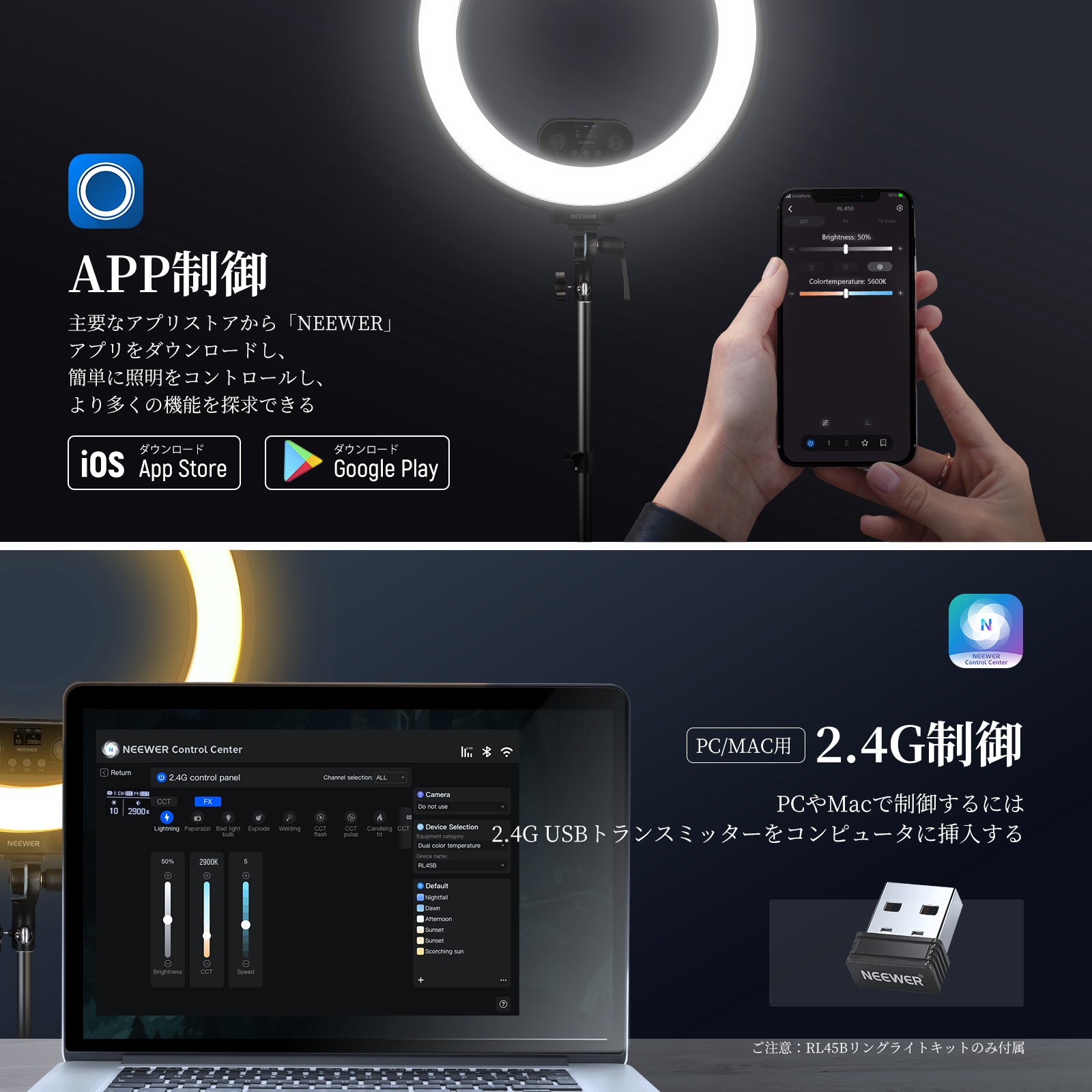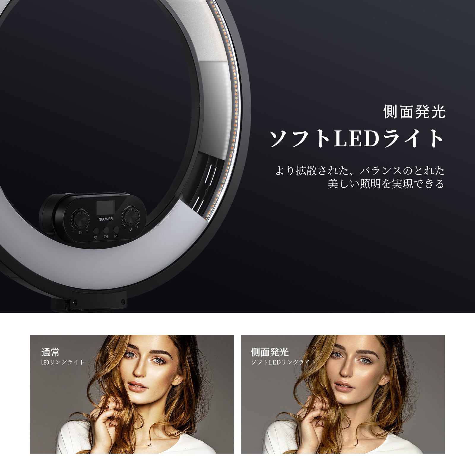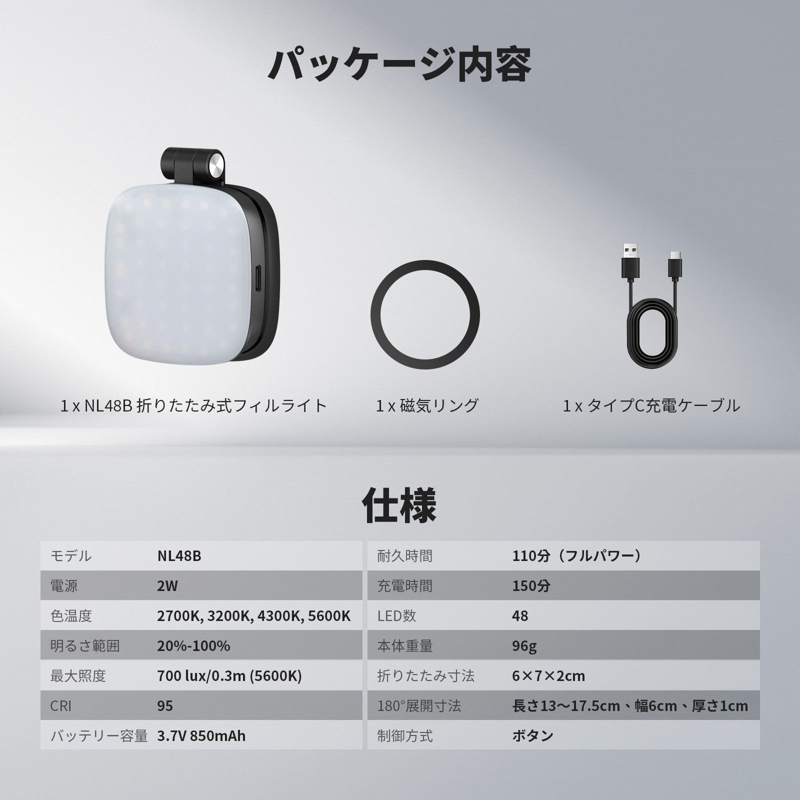 3200K~5600Kの色温度、0~100%の調光範囲、97+の高いCRI、21Wの電力、105個の暖色LED、および105個の冷色 LED を備えています。YouTubeのビデオ録画、ビデオブログ、ゲーム、ライブストリーミング、ポートレート、製品の写真撮影に最適です。