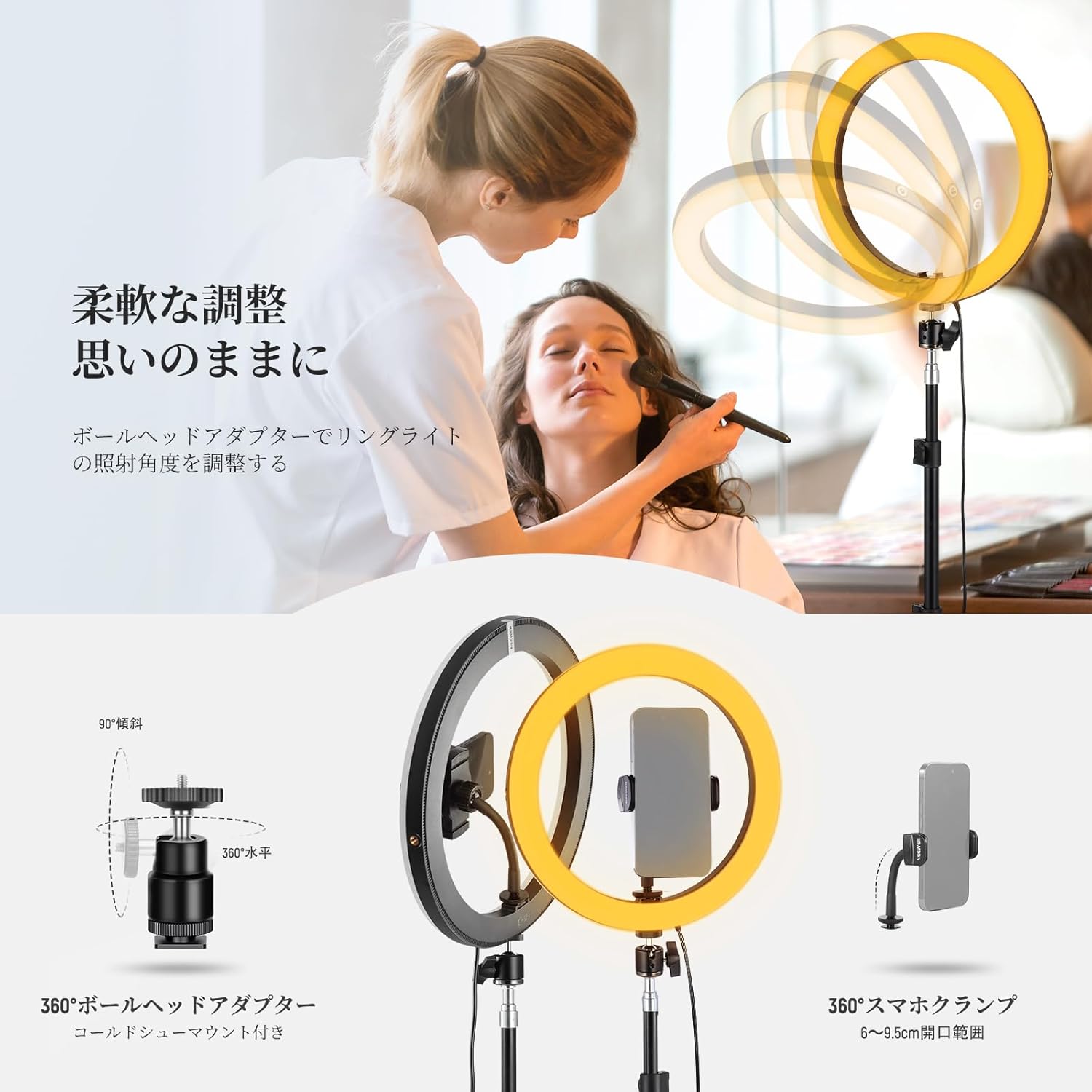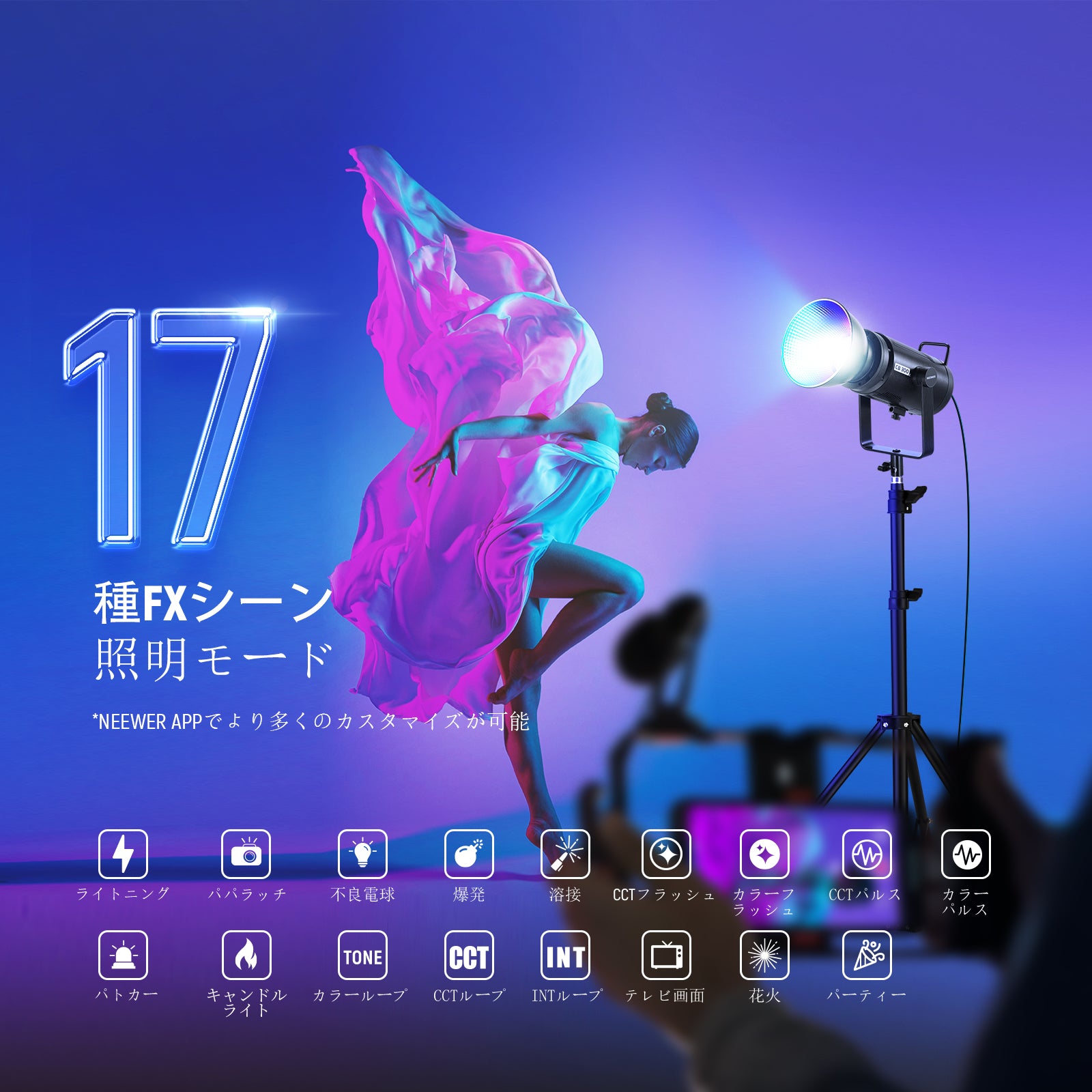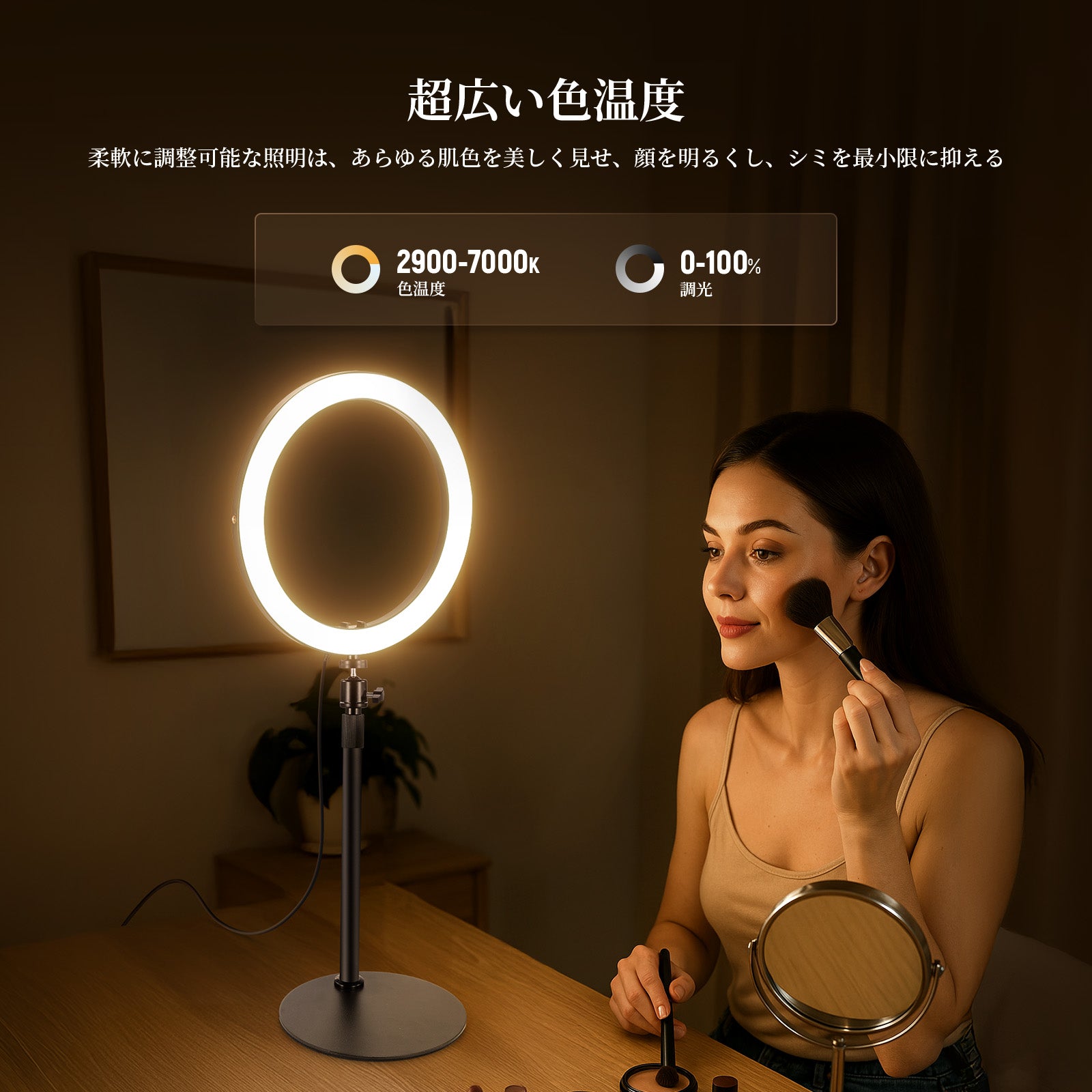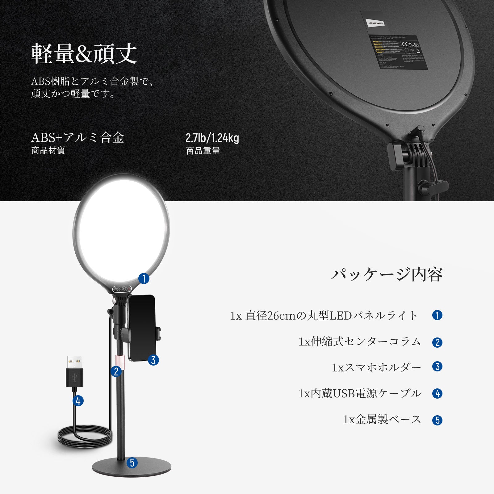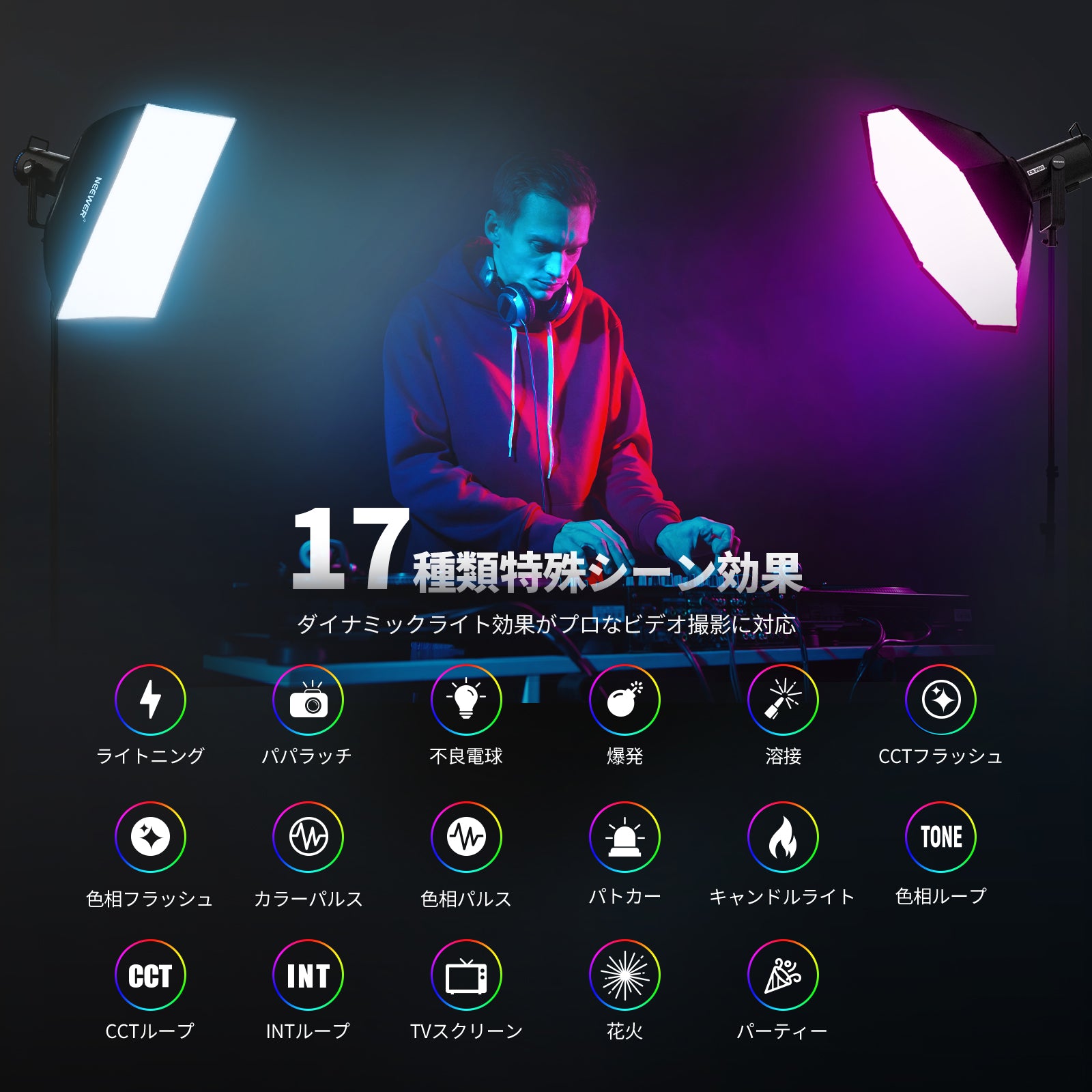3200K~5600Kの色温度、0~100%の調光範囲、97+の高いCRI、21Wの電力、105個の暖色LED、および105個の冷色 LED を備えています。YouTubeのビデオ録画、ビデオブログ、ゲーム、ライブストリーミング、ポートレート、製品の写真撮影に最適です。