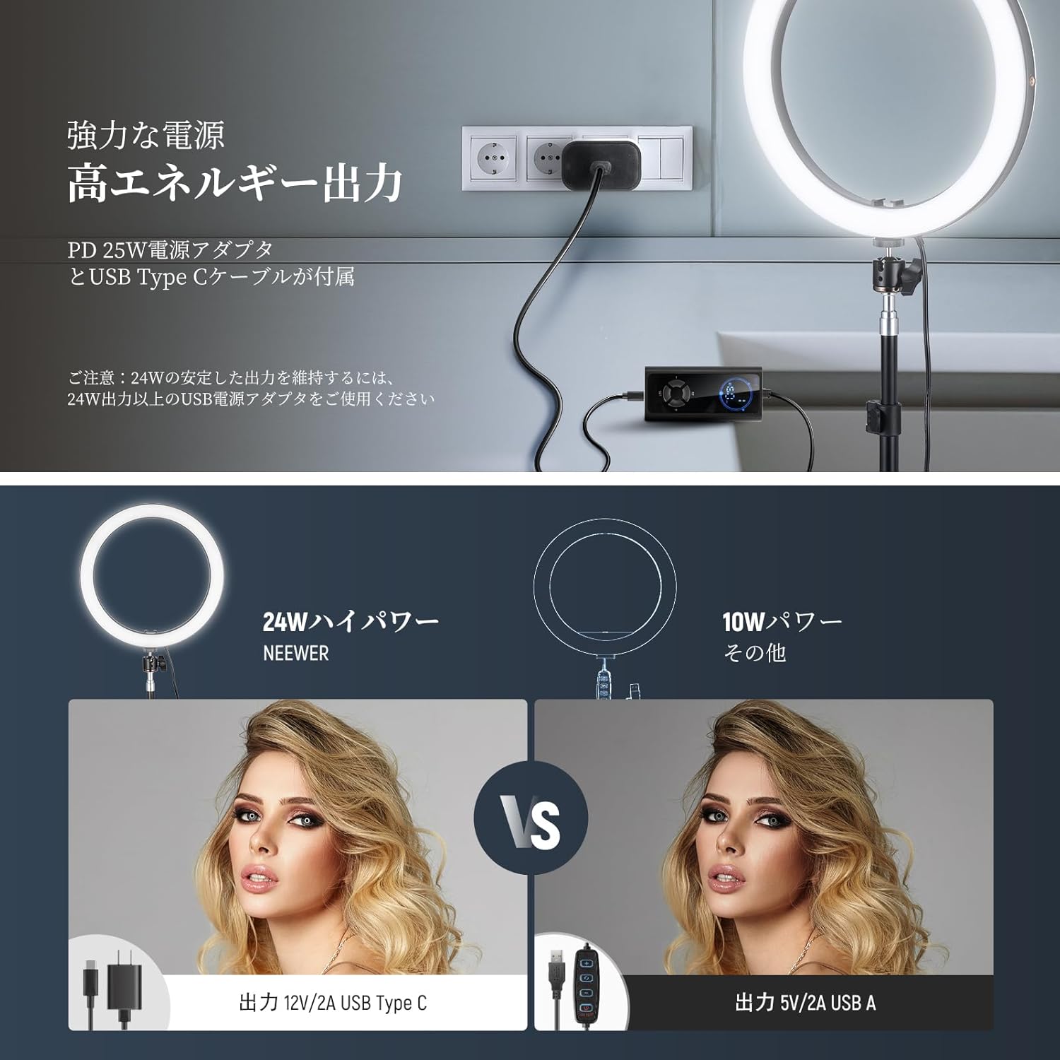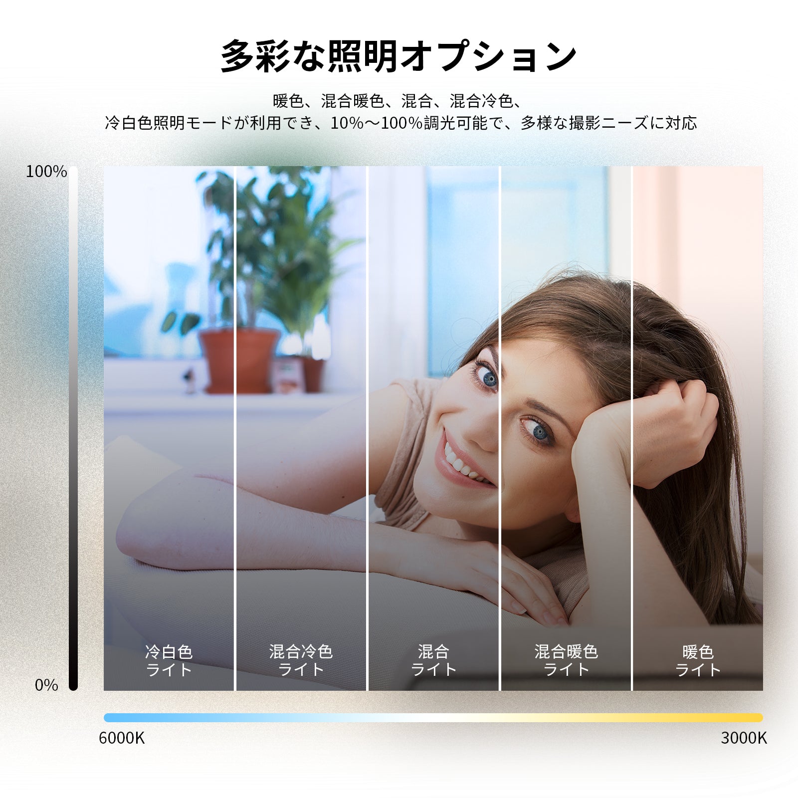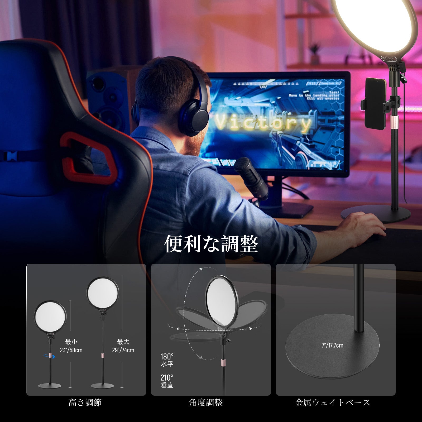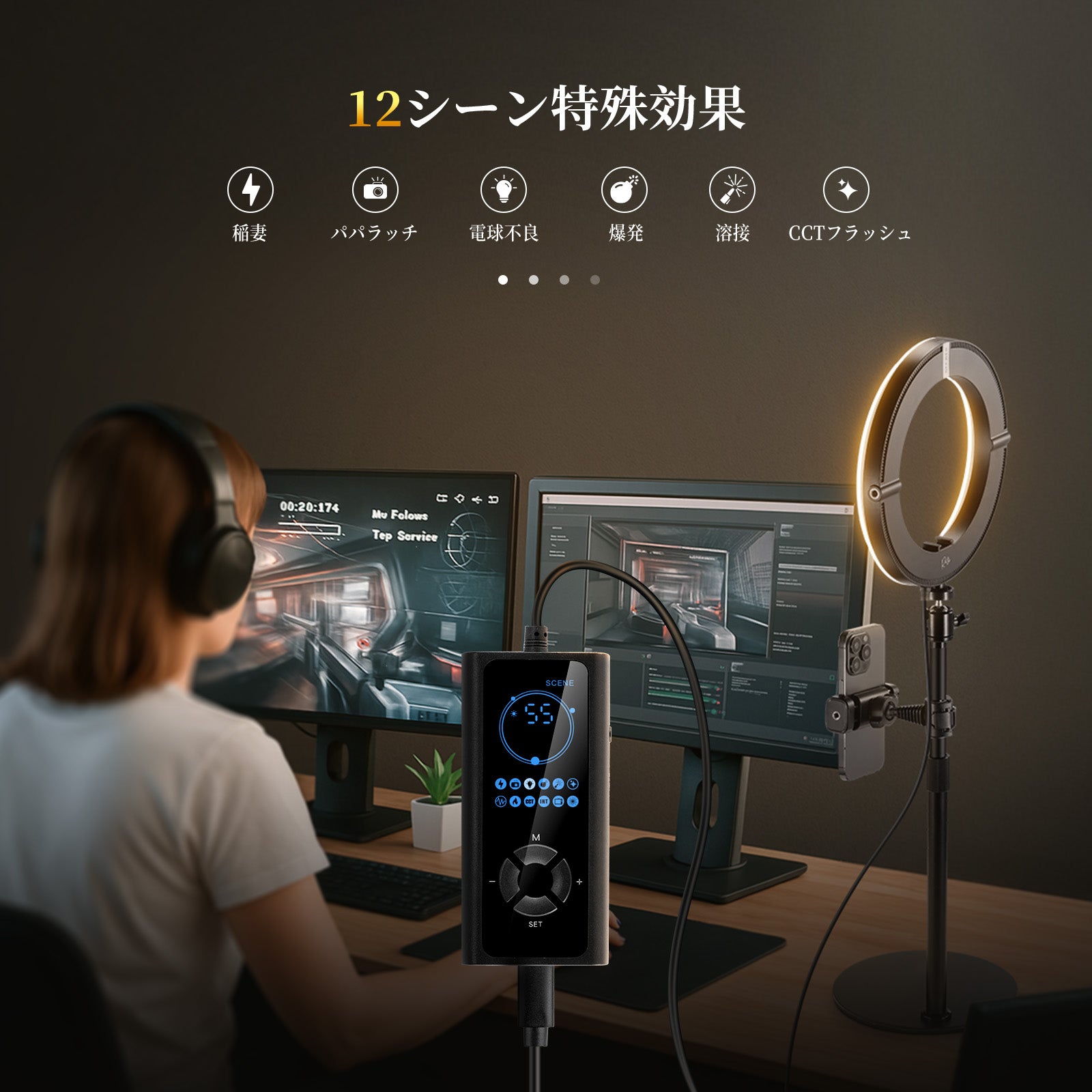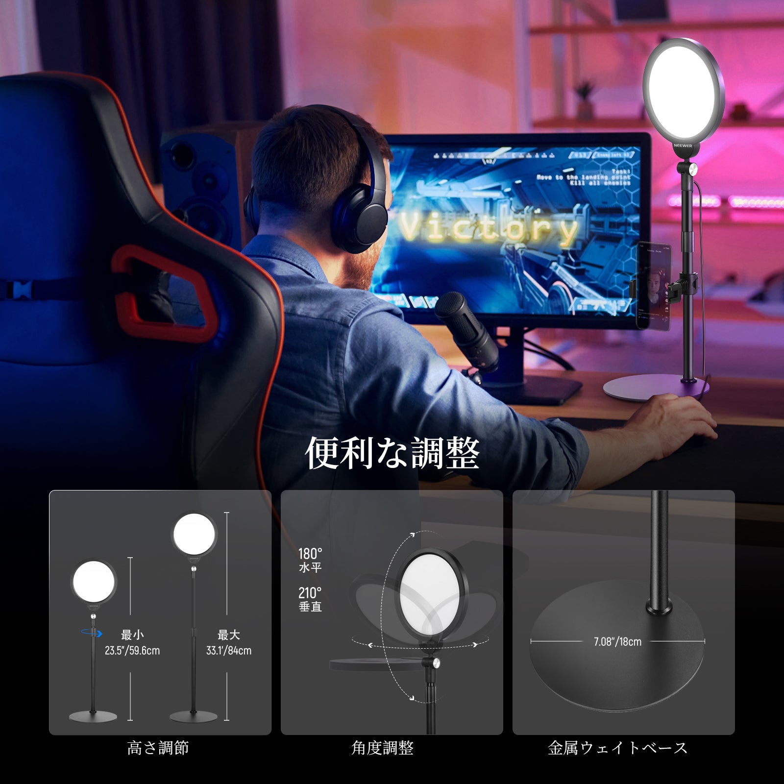 3200K~5600Kの色温度、0~100%の調光範囲、97+の高いCRI、21Wの電力、105個の暖色LED、および105個の冷色 LED を備えています。YouTubeのビデオ録画、ビデオブログ、ゲーム、ライブストリーミング、ポートレート、製品の写真撮影に最適です。