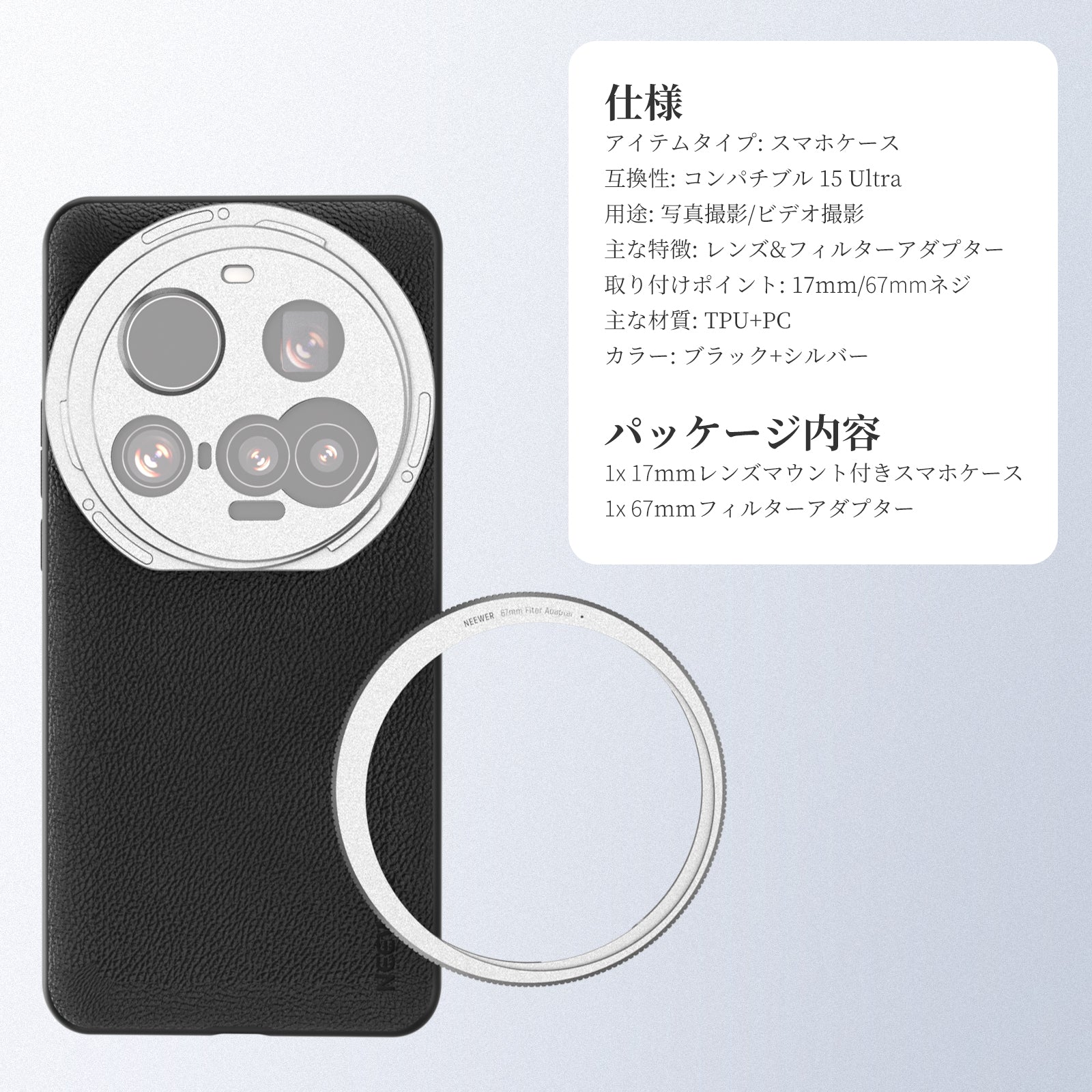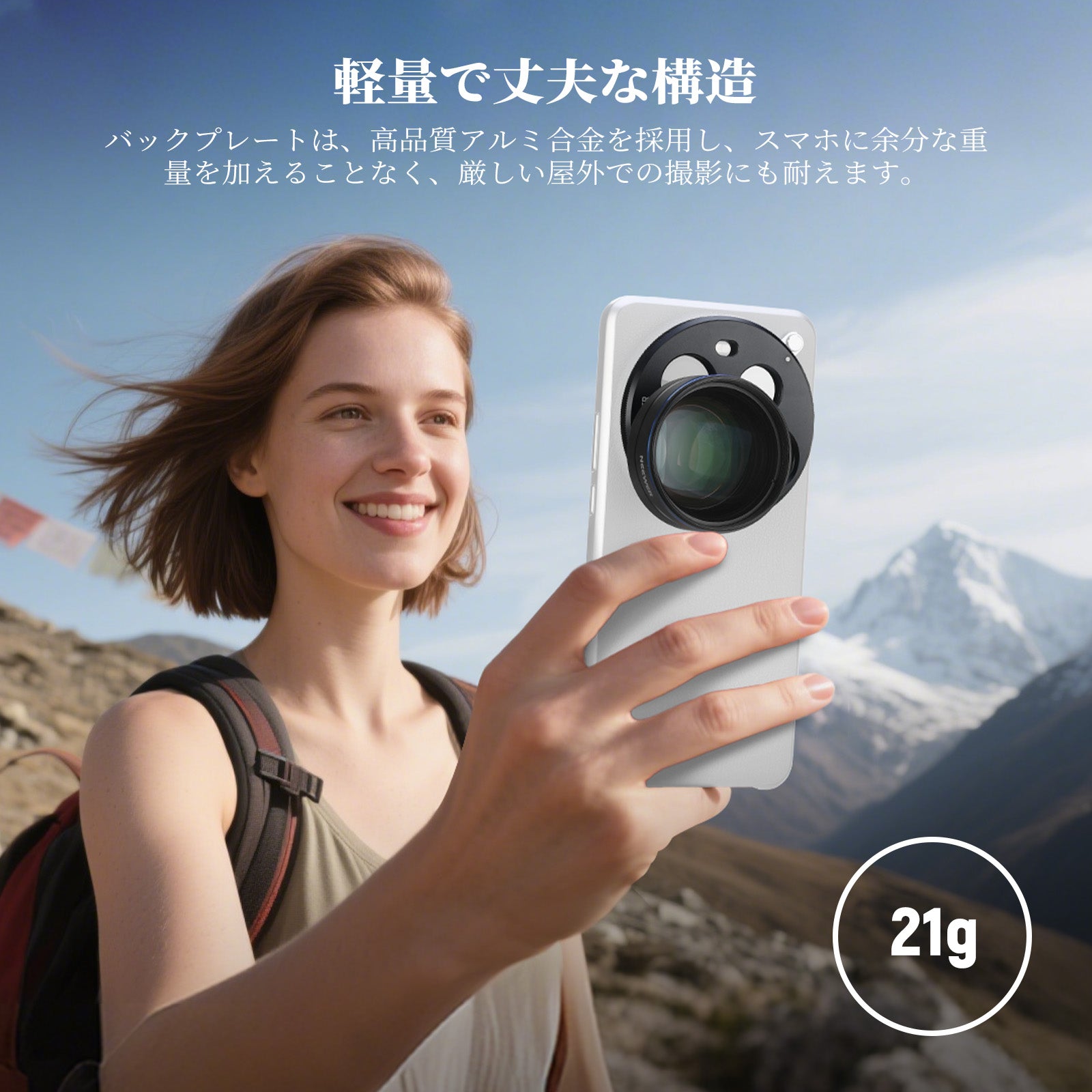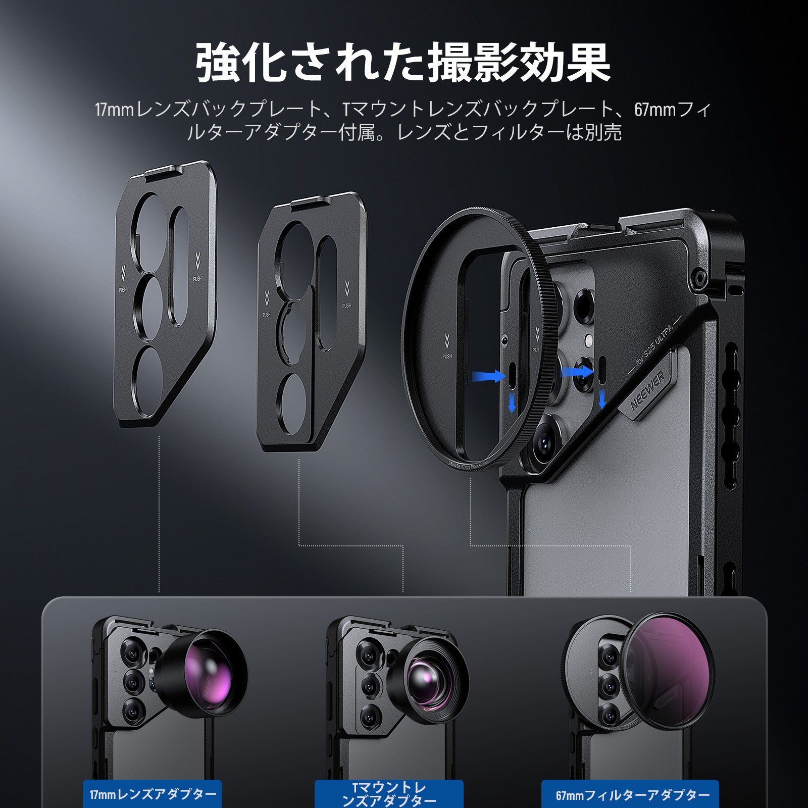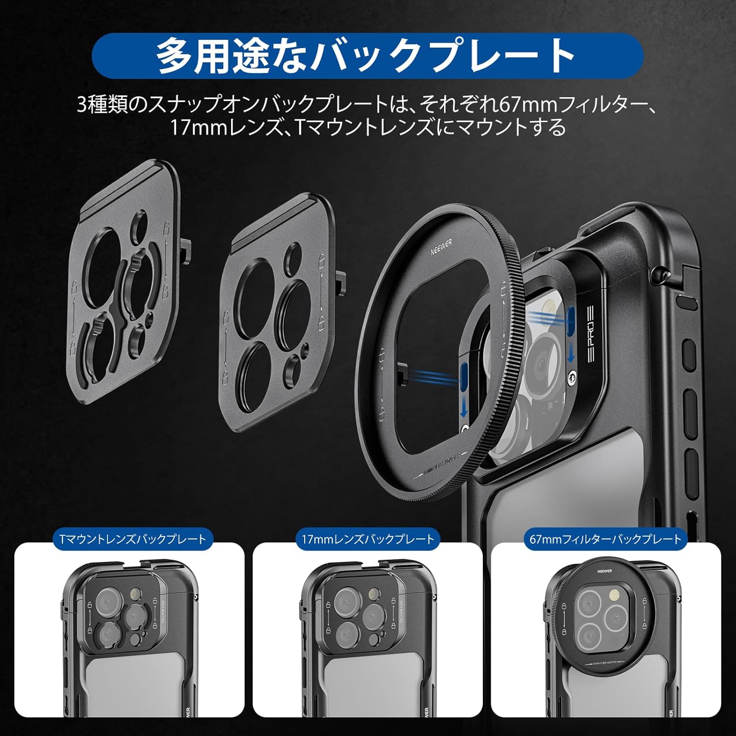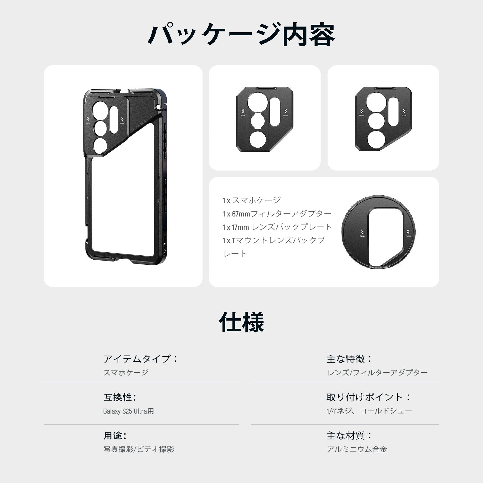 耐衝撃性のあるラバーライニングでスマートフォンを保護しながら、動画撮影、YouTube/TikTokのVlog、ライブ配信、モバイル写真撮影、映画制作などに活躍します。また、フィルターやレンズを装着できる交換式バックプレートが3枚付属しており、無限のクリエイティビティを実現します。