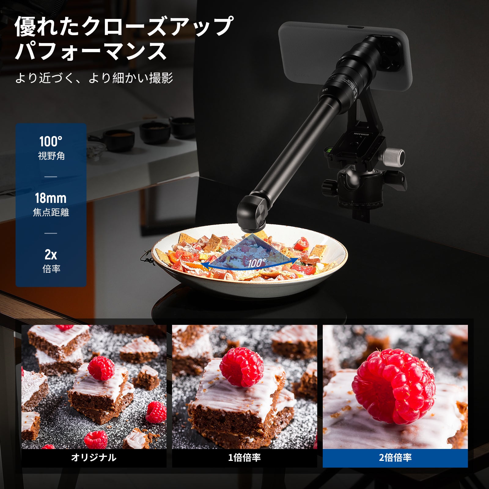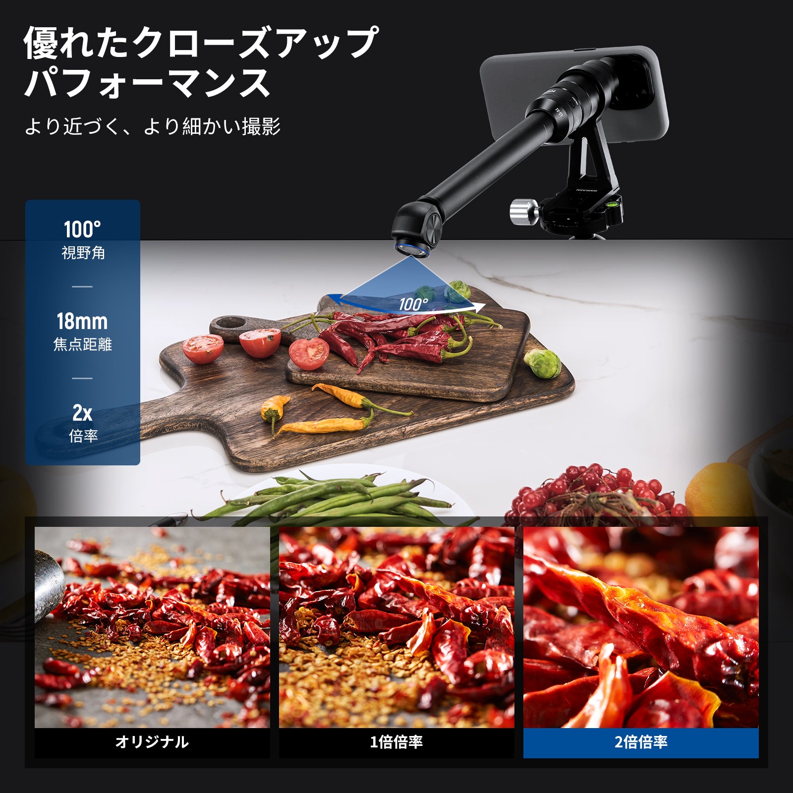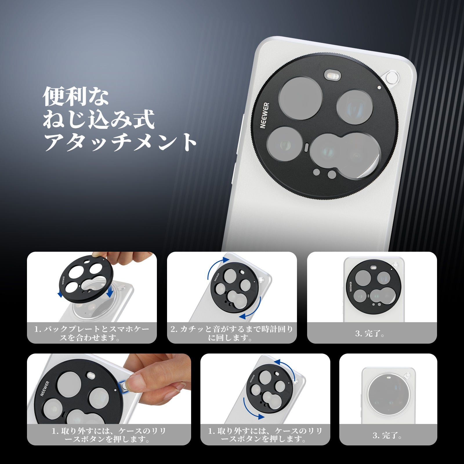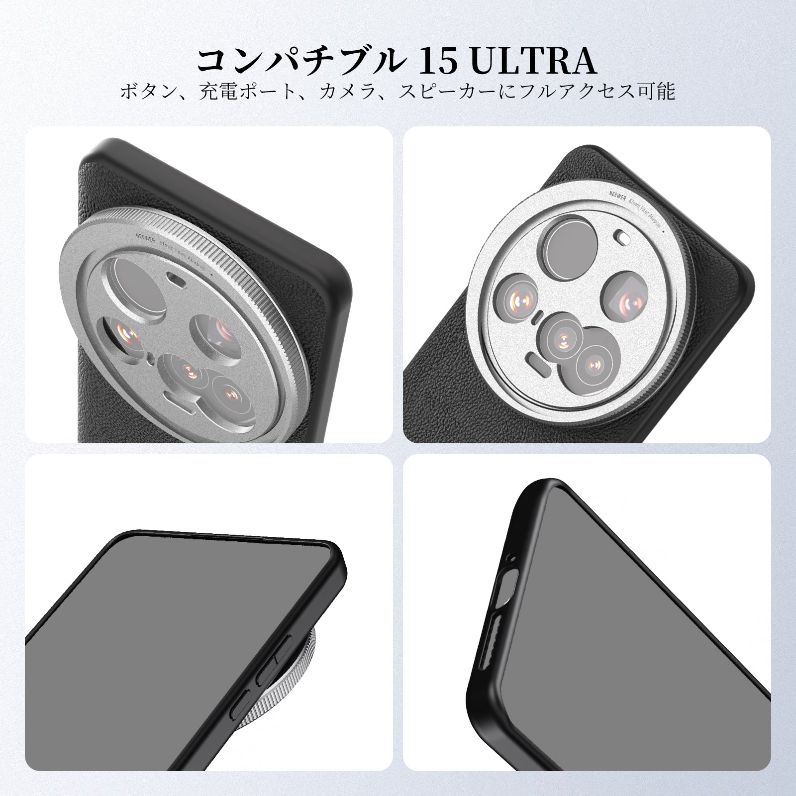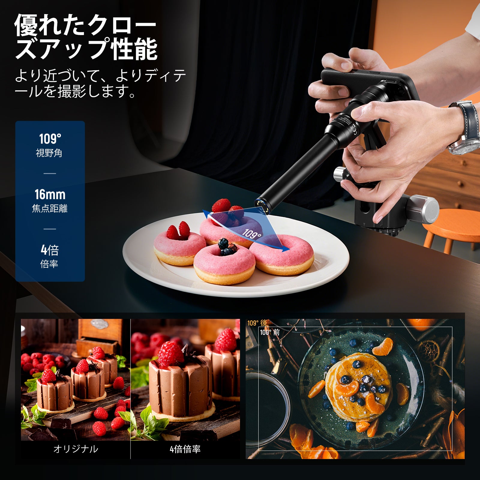 耐衝撃性のあるラバーライニングでスマートフォンを保護しながら、動画撮影、YouTube/TikTokのVlog、ライブ配信、モバイル写真撮影、映画制作などに活躍します。また、フィルターやレンズを装着できる交換式バックプレートが3枚付属しており、無限のクリエイティビティを実現します。