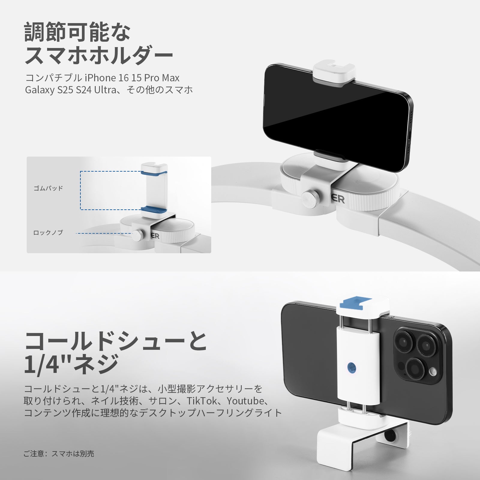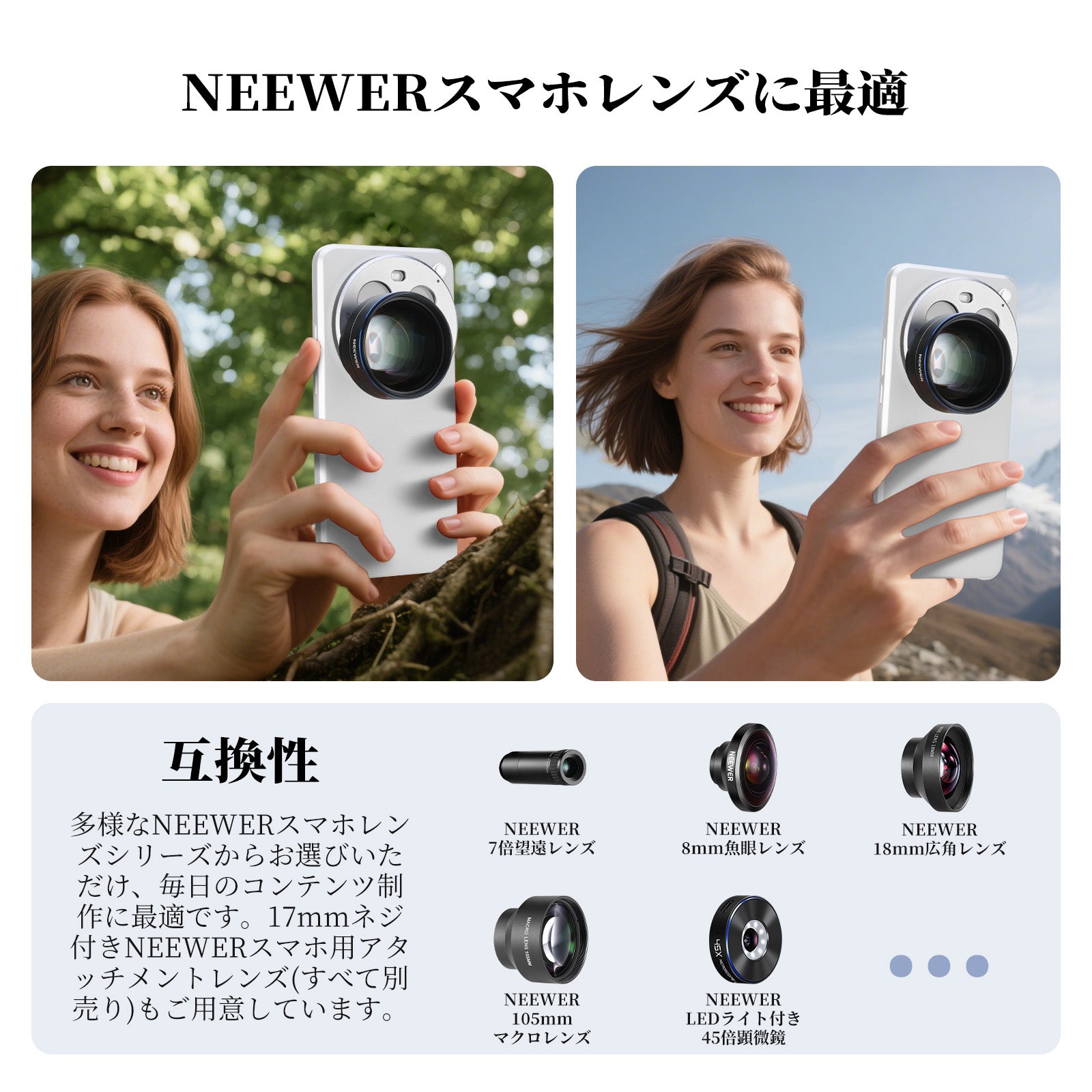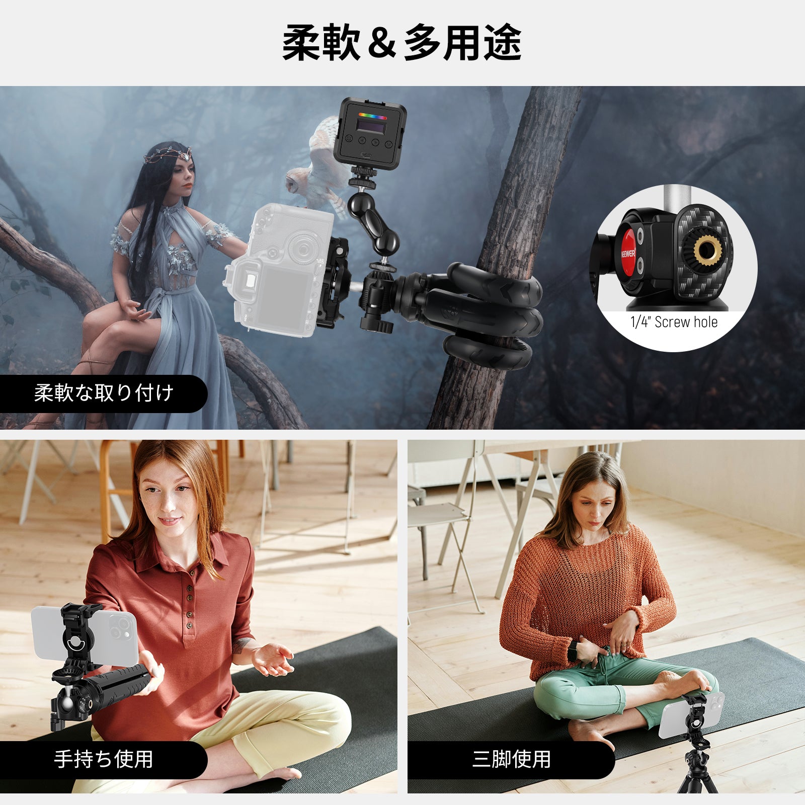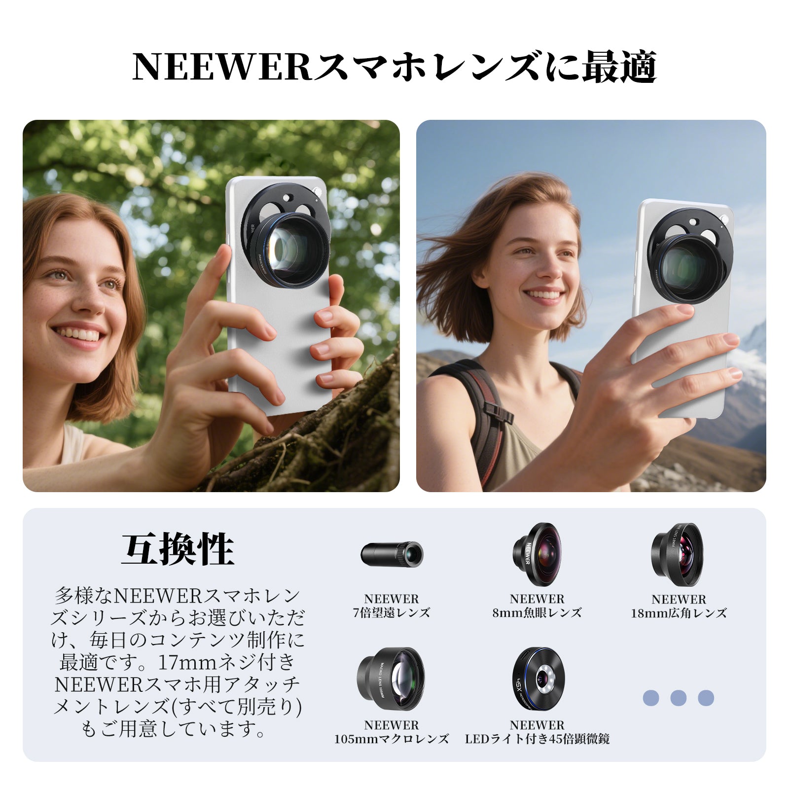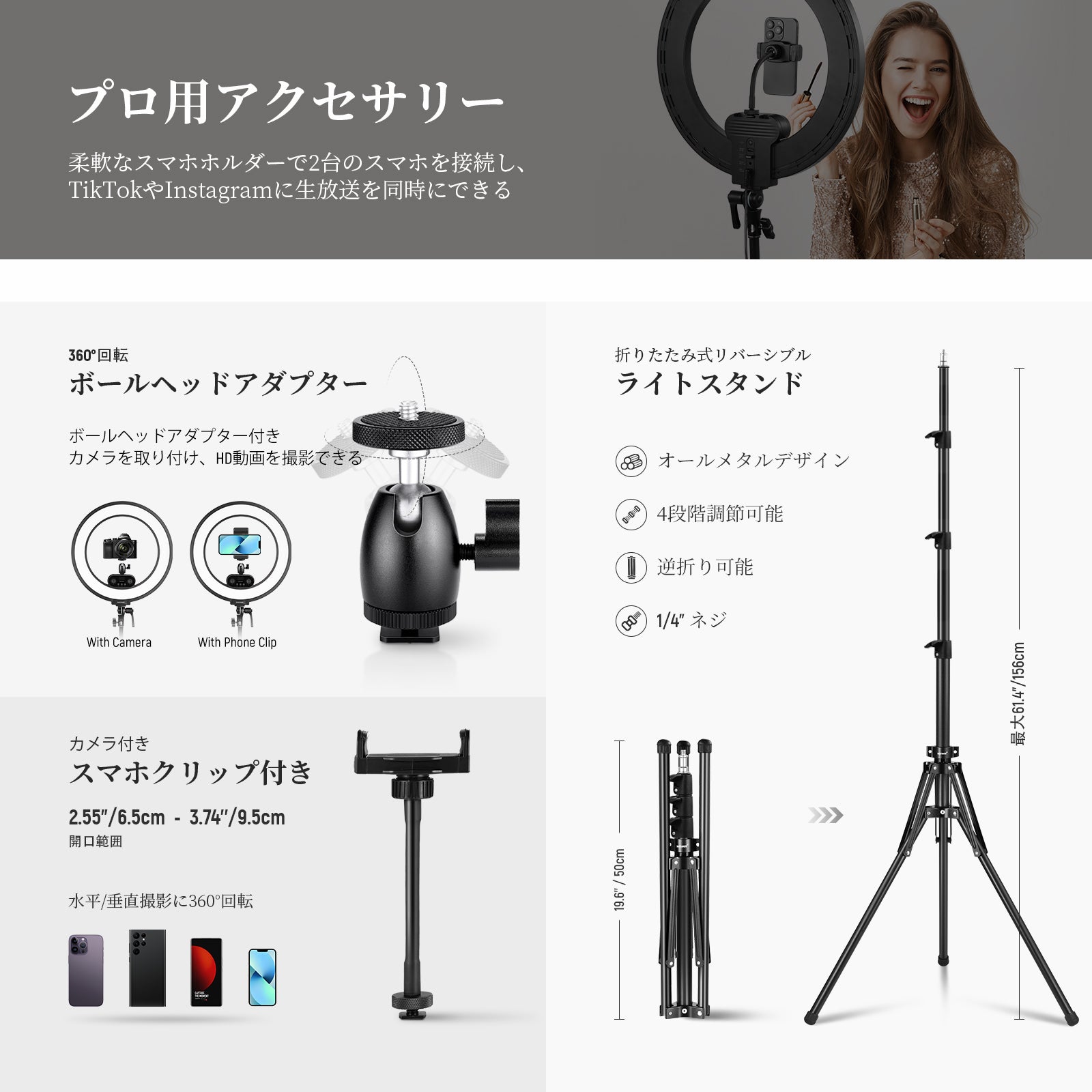 耐衝撃性のあるラバーライニングでスマートフォンを保護しながら、動画撮影、YouTube/TikTokのVlog、ライブ配信、モバイル写真撮影、映画制作などに活躍します。また、フィルターやレンズを装着できる交換式バックプレートが3枚付属しており、無限のクリエイティビティを実現します。