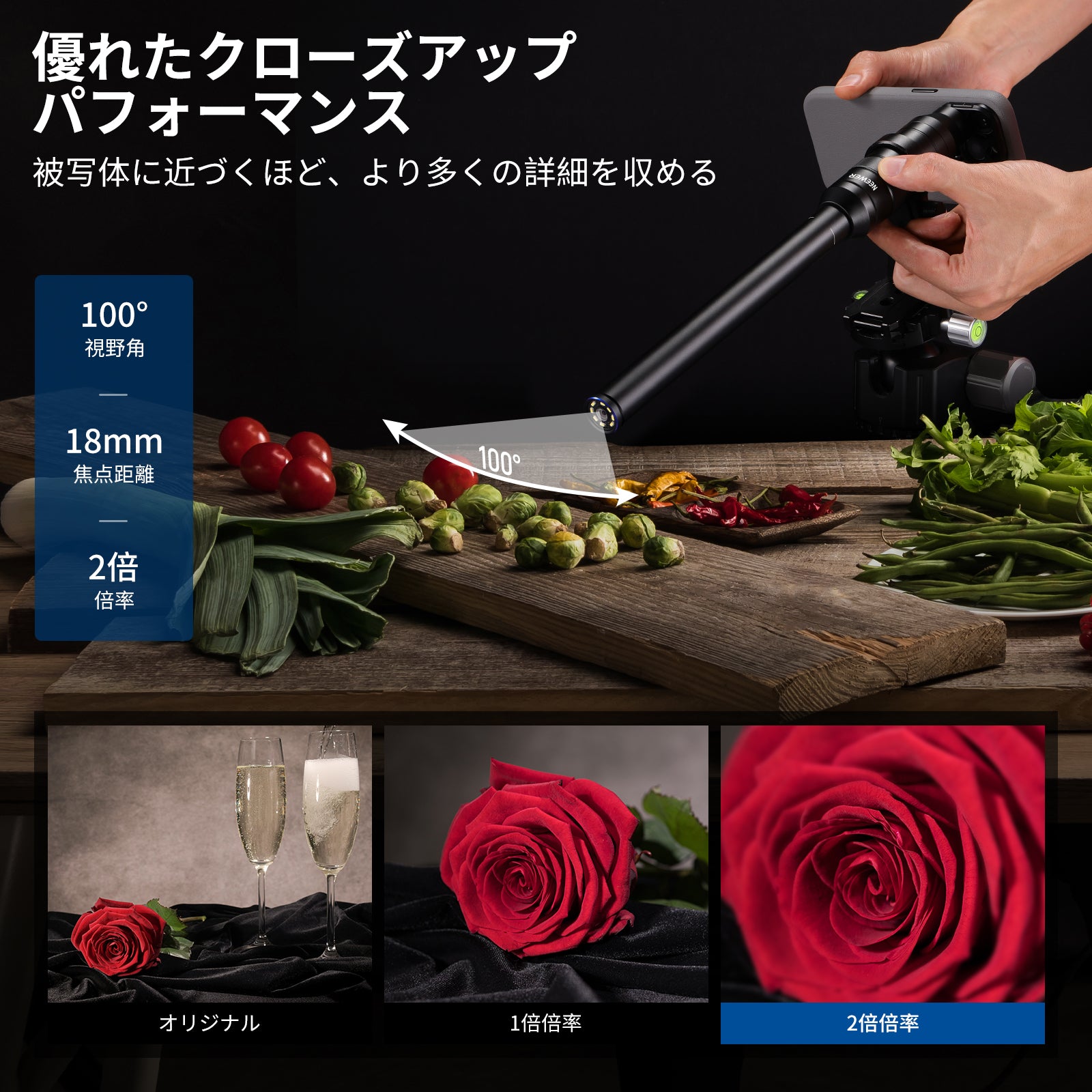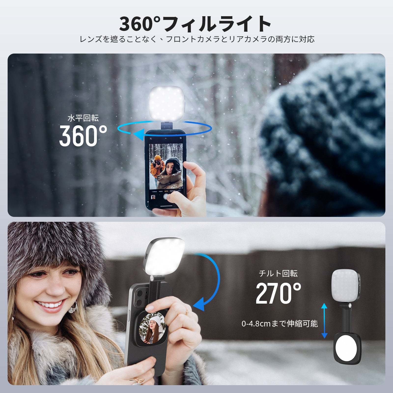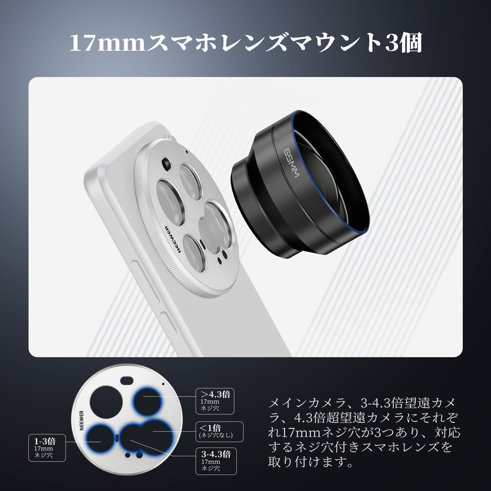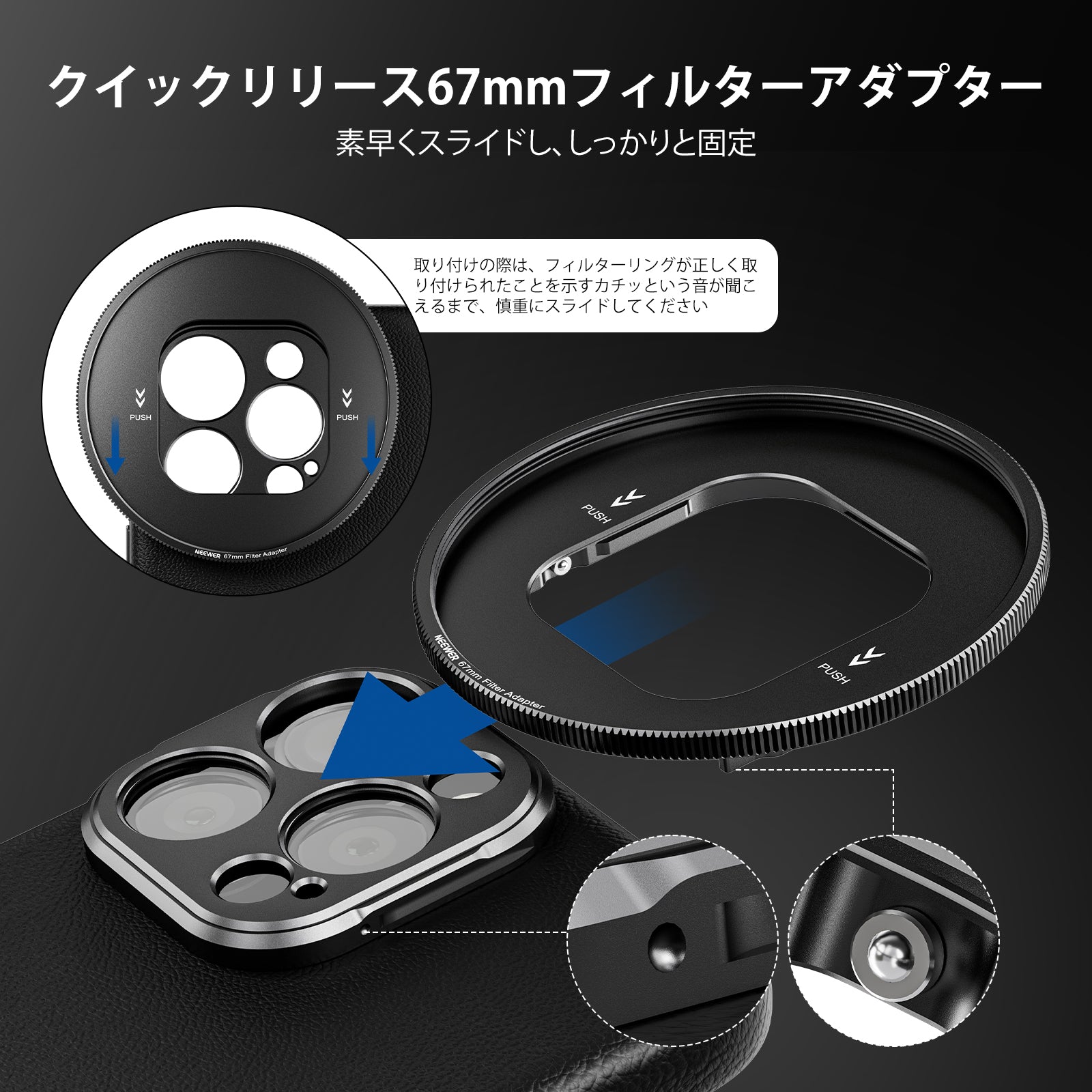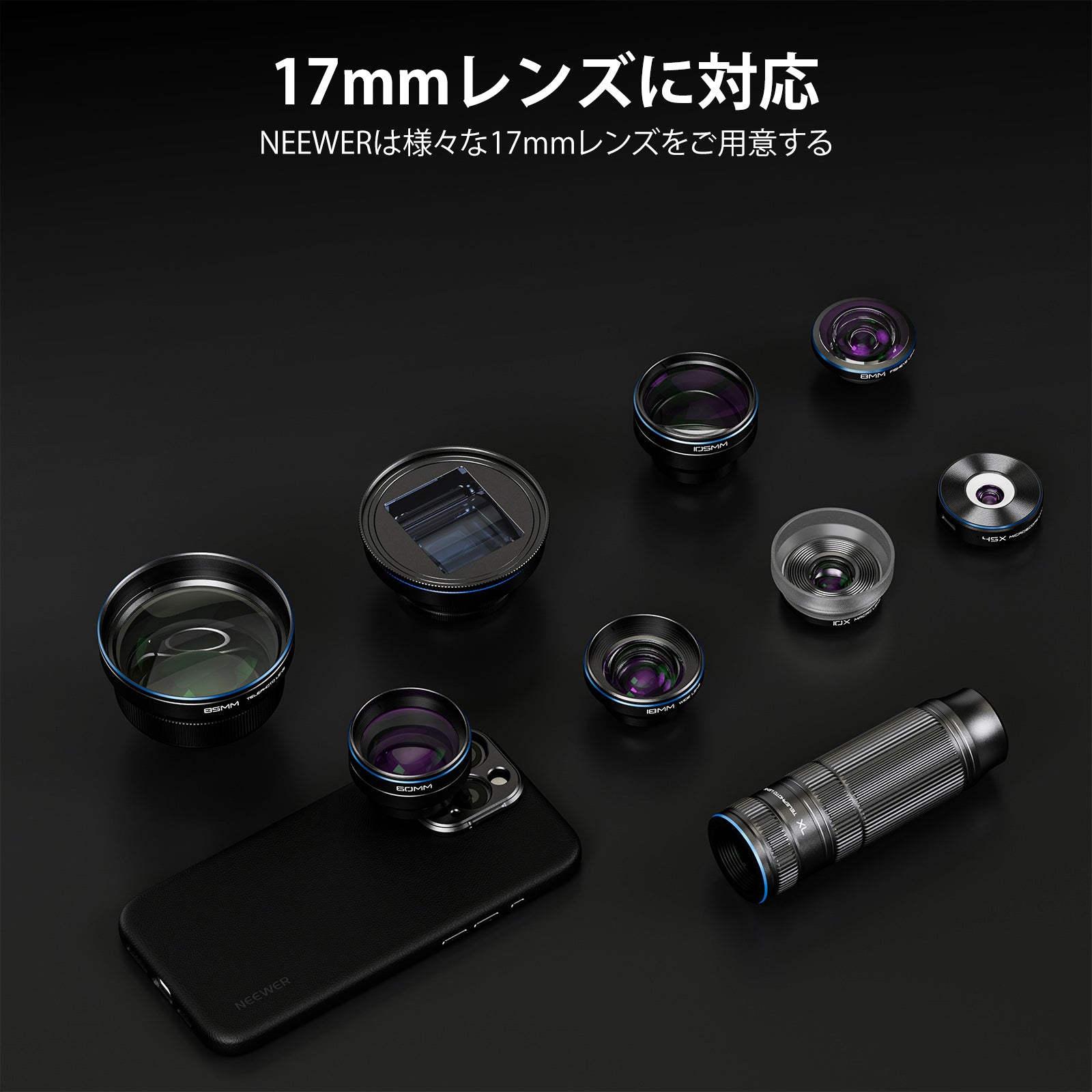 耐衝撃性のあるラバーライニングでスマートフォンを保護しながら、動画撮影、YouTube/TikTokのVlog、ライブ配信、モバイル写真撮影、映画制作などに活躍します。また、フィルターやレンズを装着できる交換式バックプレートが3枚付属しており、無限のクリエイティビティを実現します。